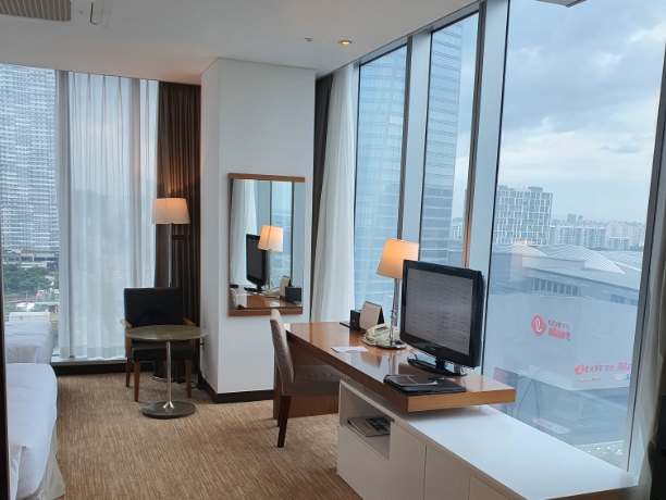 제 평가는 인터넷 좋은 뷰 사진만 너무 믿지 마시고 직원 생각보다 불친절~청소 상태 별로~객실 환기 안됨~공기질 최악~수영장 좋고 교통 접근성 좋고 롯데마트 있어서 좋고!!