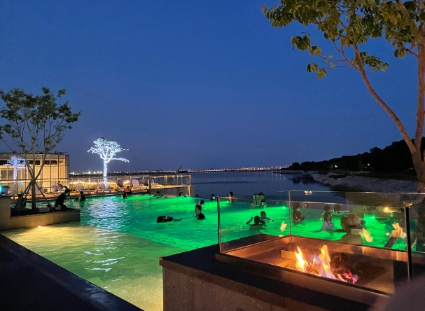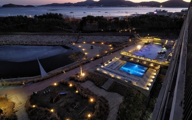 외부 수영장에도 젊은 연인들이 많았고 야경이 예뻤어요. 방 외에도 조식, 룸바등 추기비용이 들었고 오션뷰가 서해바다라 그런지 반은 호수, 반은 바다인데 바다느낌이 크게 나지 않아 조금 아쉬웠습니다.