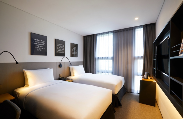 스탠다드 트윈룸으로 예약했는데 딱 가성비 호캉스로 좋은 호텔이었다 넓지는 않지만 깔끔했고 침대도 푹신푹신했다