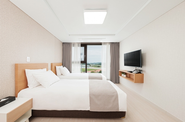 오픈한지 1~2년 정도 되어 보이며 건물과 시설들의 상태는 괜찮습니다. 체크인은 직원이 부재중이면 프론트 옆에 있은 기계를 사용할 수도 있습니다. 스탠다드 트윈으로 6층에서 하루 묵었으며 방에서 뷰는 양양 종합운동장이 바로 보이고 앞에 가리는 건물이 없어 좋습니다. 더블룸은 반대편 설악산 쪽이 보인다고 합니다.