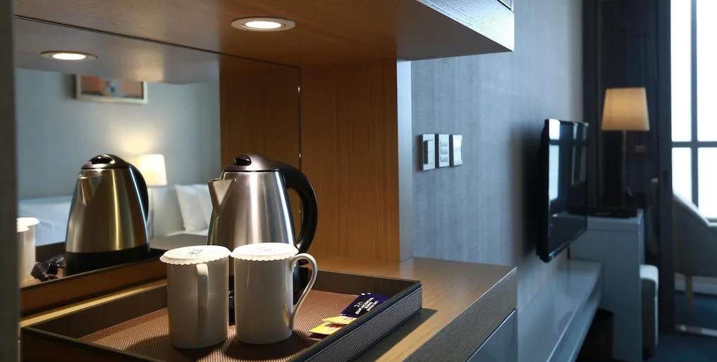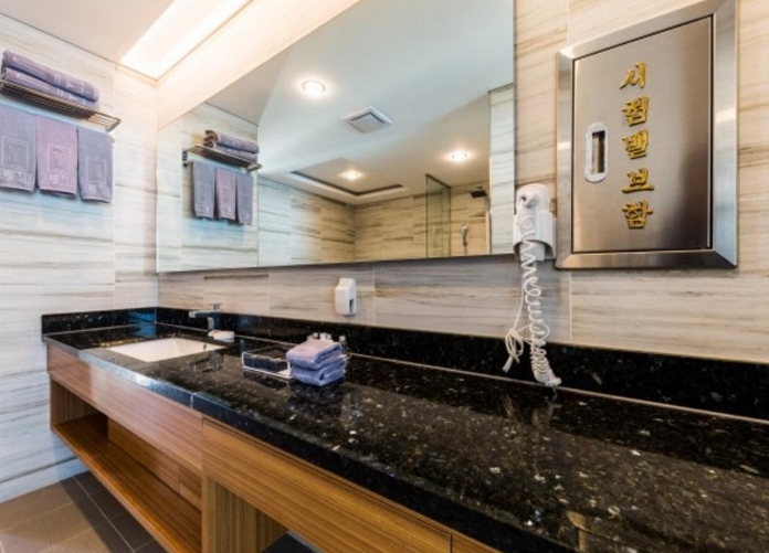 안에 포트기 컵 있고 수납공간 널널하고 어메니티는 치약칫솔 비누 면도기 로션빼고 다 있음 욕조크기가 널널함 아침에는 소음이 쫌 있었음 여기저기 드르륵드르륵 뭘 끄는소리가 엄청 들리고 청소소리도 너무 큼 9시 쫌 넘어서부터 시끄러웟음