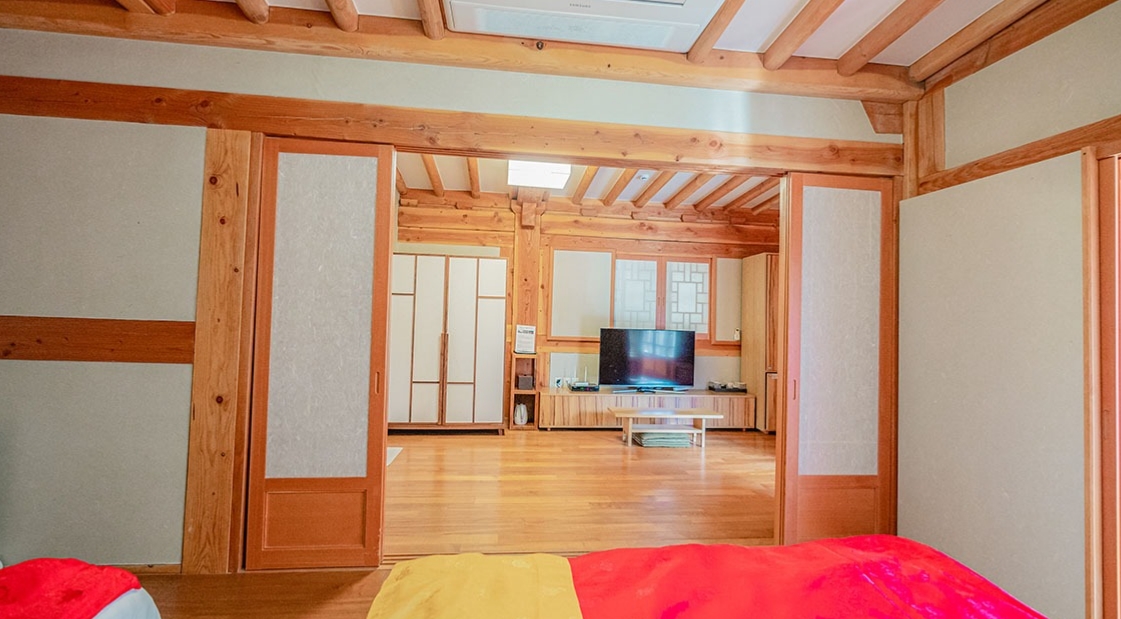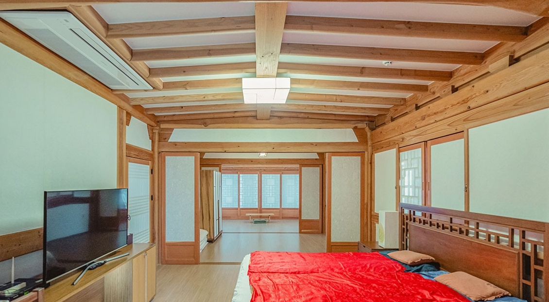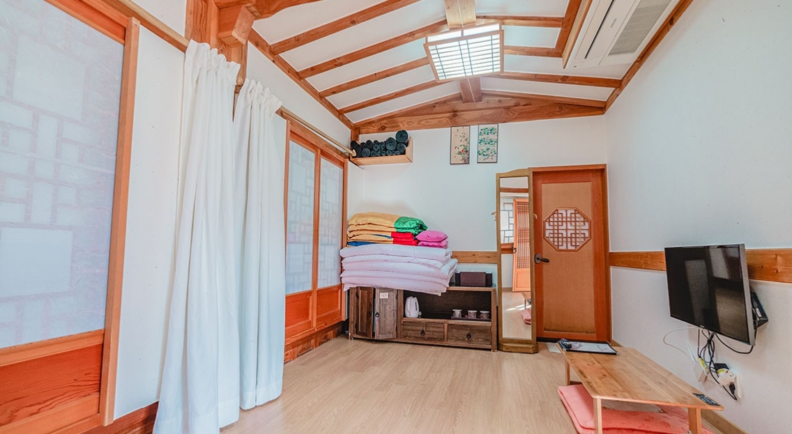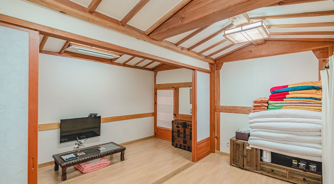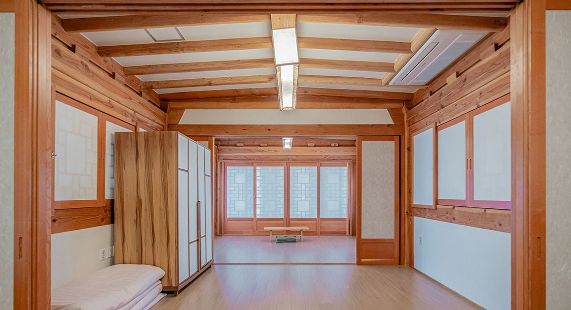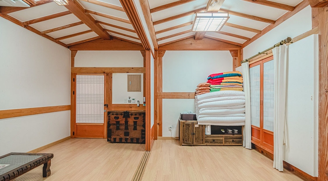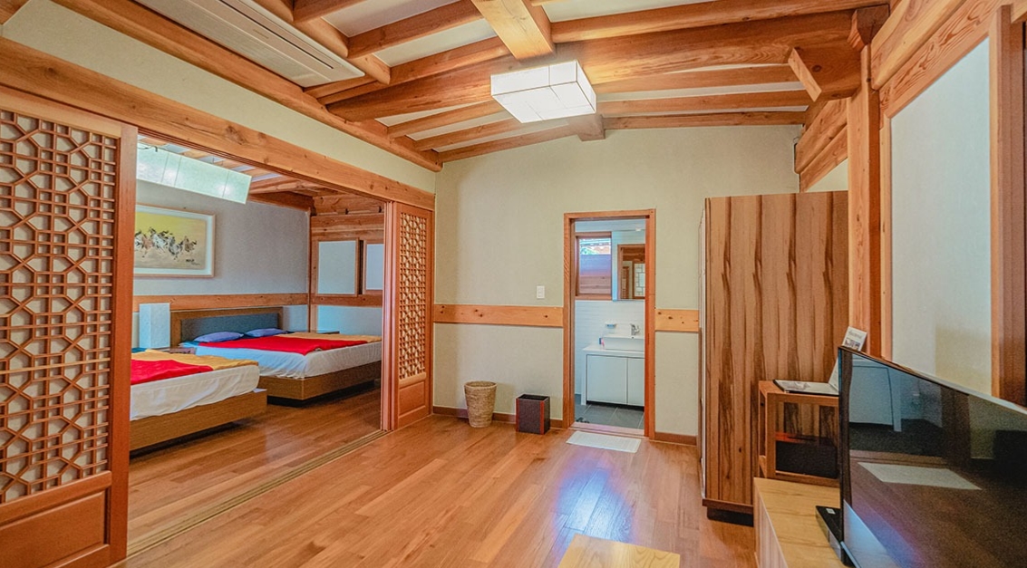 한옥의 특징이 많음. 다만 한옥이 처음인분들은 불편할 수도. 예를 들어 문턱이 높아 다니기 불편. 방은 침구 네 개를 깔아도 될 정도로 넓음