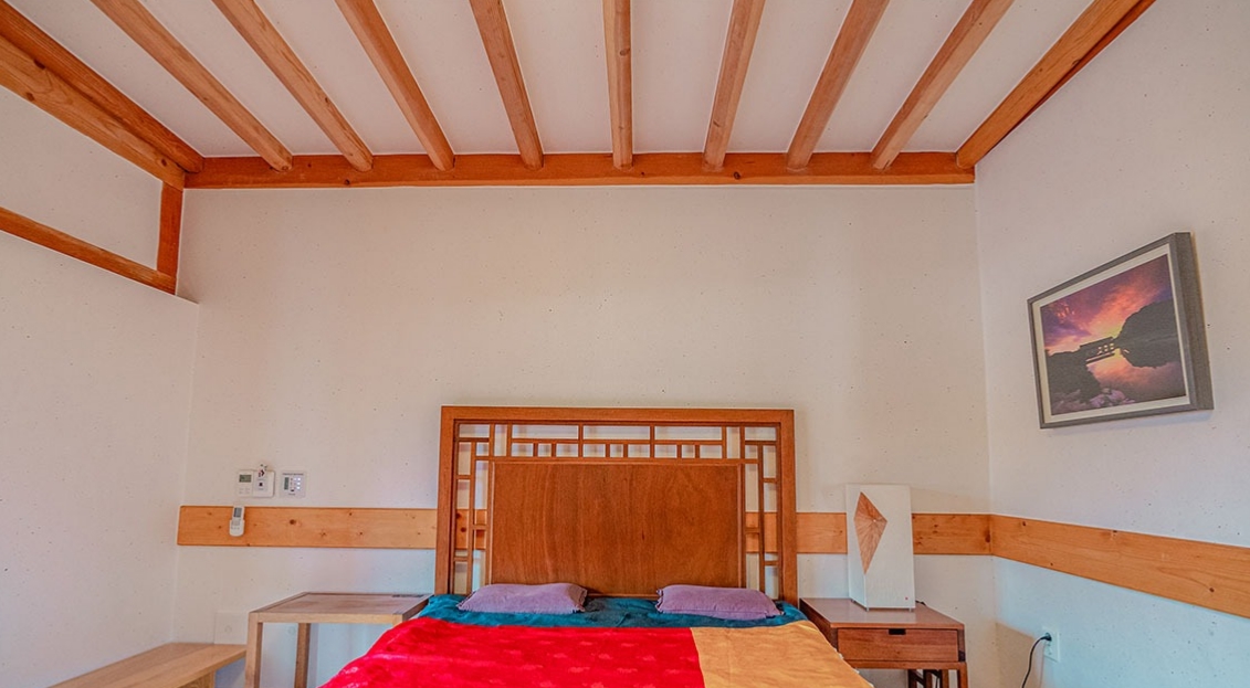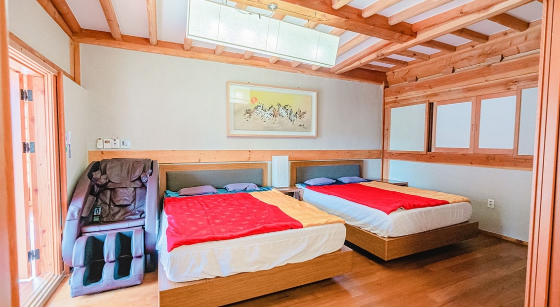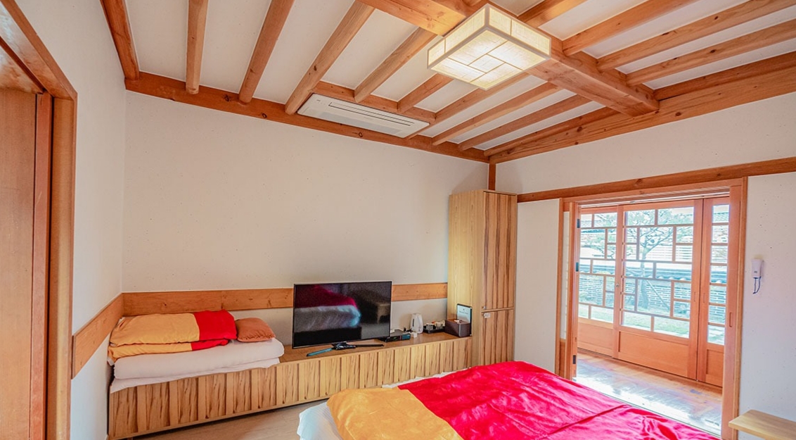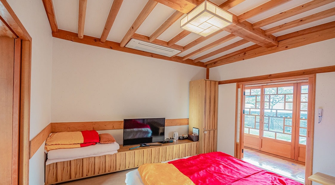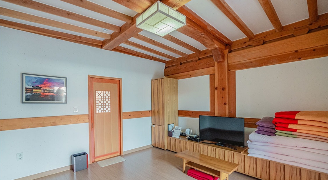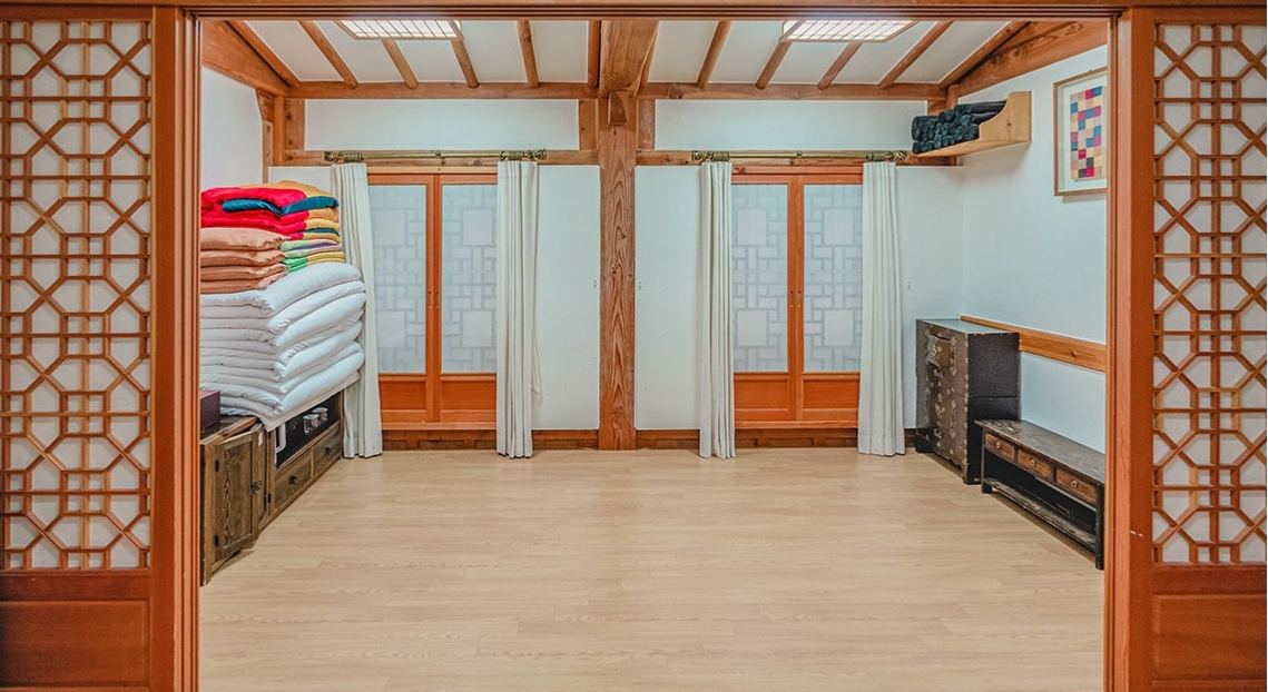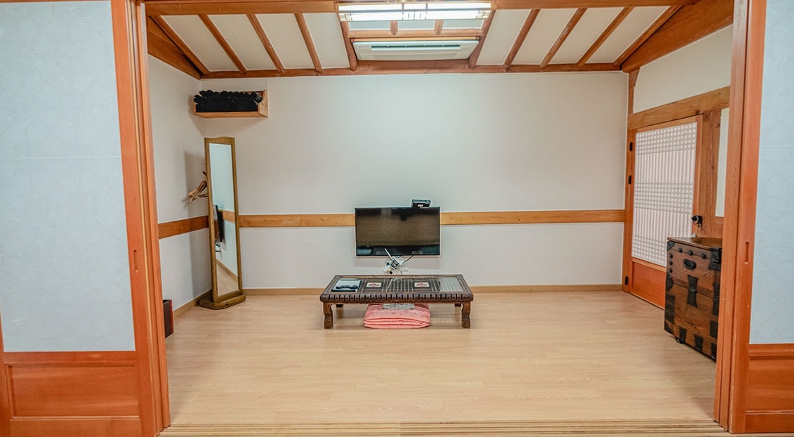 한옥의 특징이 많음. 다만 한옥이 처음인분들은 불편할 수도. 예를 들어 문턱이 높아 다니기 불편. 방은 침구 네 개를 깔아도 될 정도로 넓음