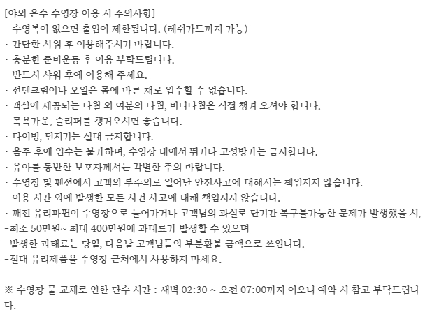 방음도 안 되는가 했으나 창문이랑 다 닫으니까 잘되더라구요 ㅎㅎ 밤에는 딱히 소음 없었던 거 같아요 (낮에는 앞에 풀장이라 노는 소리 어쩔 수 없음 낮엔 우리도 나가 놀아서 사실 못 들어봄) 풀장도 36-41도로 계속 유지되어서 너무 따뜻하고 좋았어요 수건도 넉넉하게 챙겨주셔서 가져간 수건 하나도 안 쓰고 다들 돌아왔어요 ㅋㅋㅋㅋ 바