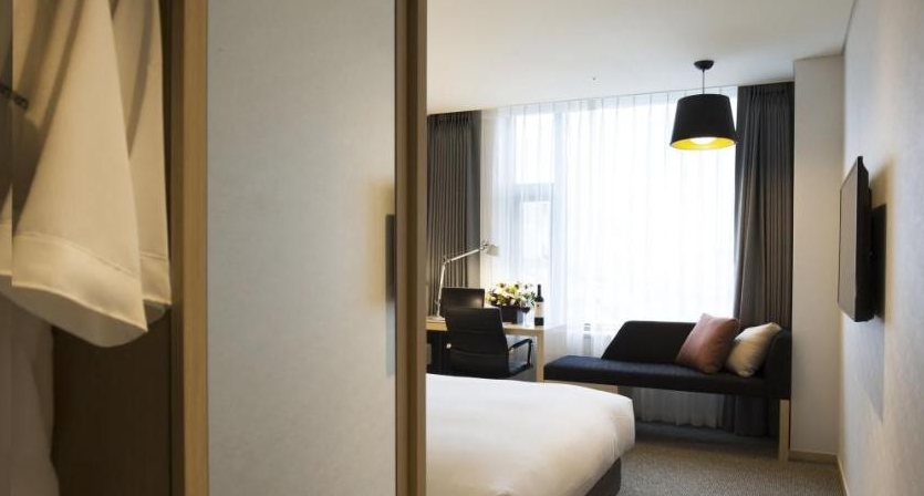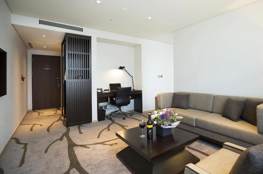 밤에 집 가기 귀찮고 피곤해서 혼자. 하룻밤 숙소에서 쉬었는데 나름 괜찮았어요. 잘 쉬다갑니다. 엘리베이터 탈 때 객실 키를 대야만 층수를 누를 수 있는 시스템이 좋았어요. 인테리어 책상도있고 소파도 있고 방 같았어요. 냉장고에는 생수 2병이 있었습니다. 바닥은 카펫인데, 신발장 구분없이 신발 신고 바로 객실 들어오는 부분이 저는 좀 이질감이 들었네요.