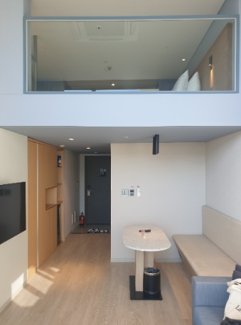 4. 복층 객실의 2층은 층고가 매우 낮아서 불편하며, 테라스에 의자 한 개도 없어서 테라스는 있으나 딱히 의미가 없습니다. 소파도 딱딱하고 얇은 매트만 있고 별도의 커버가 없어 앉기 매우 찝찝했습니다. 전체적으로 인테리어 퀄리티는 호텔이 아닌 좀 비싼 모텔 정도입니다.