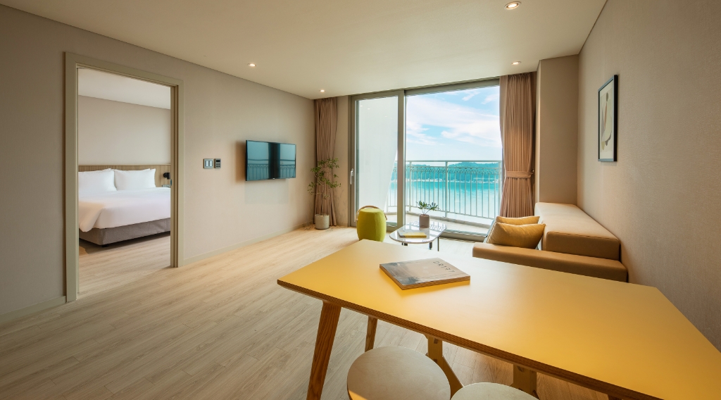 이 리조트는 룸 보다 리조트의 루프탑이 제일 좋았습니다. 룸에서 보이는 뷰는 so so하지만 루프탑에 올라가면 완전 멋진 서해를 만날 수 있습니다. 꼭 루프탑에 올라가 보세요. 리조트에서 먹을 수 있는 세트 음식을 포장해서 와인과 마셨는데 너무 좋았어요. 와인잔이나 오프너도 프론트에서 빌려주더라구요. 어반 마루는 침대가 아니라서 저는 좀 불편했어요. 저상이지만 침대랑 똑같겠지 하는 생각이었는데 직접 써 보니 불편했으니 참고하세요
