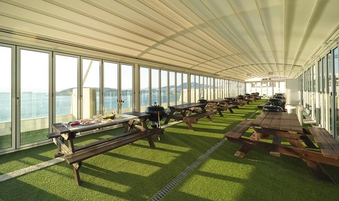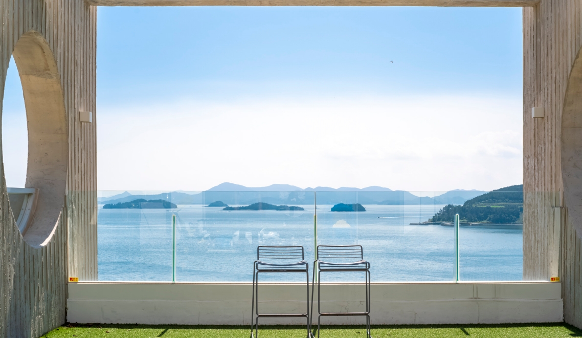 여수 바다가 아름다운 풍경을 이루고 있어 이국적인 분위기를 느낄 수 있습니다