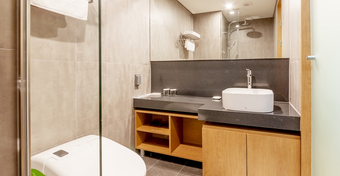 단점: 인테리어가 부실. 콘센트 덮개가 벽에서 빠져있었음 공사 하다가 말았나 했음! 화장실 유리가 뿌연 유리로 되어있어 불편하다. 문 옆쪽에 변기가 있어 실루엣이 보임... ㅠㅠ 해바라기 샤워기/ 일반 샤워기 변환 되는 꼭지가 잘 안되어 여러번 물벼락 맞음.. 샤워기 헤드도 깨져있어서 물줄기가 옆으로 나오기도 함.