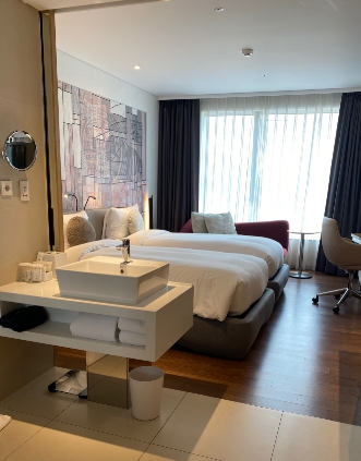 직원 분들은 다 너무 친절하고 좋으셨어요 다만 룸 컨디션이,,, 좀 별로였어요/ 객실 크기 자체는 좋았지만 샤워실 문 앞에 머리카락이 붙어 있어서 1차 당황. 호캉스 많이 다녀봤는데 휴지도 보통은 반듯하게 삼각형 모양으로 접힌 형태로 되어있는데 침대 옆, 세면대 옆 휴지 모두 누가 이미 사용한 느낌이 딱 드는 꾸깃꾸깃 구겨져 있더라구요