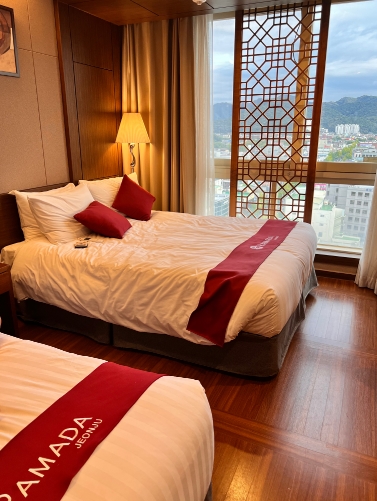 전주 라마다 호텔은 처음 방문이예요 루프탑 바도 있고 후기보고 괜찮은 것 같아서 딱 1개 남은 방을 체크인 당일에 급히 예약했어요 3명 가능한 방이 미니바 포함된 패키지였는데 간단하게 맥주 한잔 할 수 있어서 좋았어요 카펫보다 마루바닥이여서 더 좋더라구요 더블침대와 싱글침대로 3명이 묵었는데 생각보다 넓직하고 좋았어요 달도 보고 맥주도 한잔 할겸 루프탑 바에 가봤는데 아담한 사이즈였지만 맥주는 저렴한 편이였어요. 전주 라마다 호텔 깨끗하고 좋았어요 다음에 재방문 의사 100%입니다