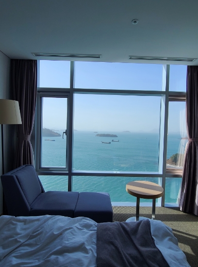 주요 역과는 거리가 있지만 조용한 곳에 위치해 있고 저는 뚜벅이 여행자라 터미널에서는 택시로 7천원정도 나오는 거리였습니다. 바로 앞에 내리는 시내버스도 있긴합니다. 여수는 처음이기도 하고 sns를 통해서 호텔에 기대감이 컸는데 사실 특급 호텔이라고는 하기엔 관리가 조금 아쉬운 부분이 있네요. 어플 이용하면 할인된 금액이 상당한데 정상 금액을 내기는 아쉬웠을 것 같네요. 그치만 여수의 호텔들 금액이 상당하기 때문에 가성비로는 괜찮다고 생각합니다. 뷰는 모든 객실 방향이 바다를 향하고 있네요. 확실히 오션뷰 입니다.