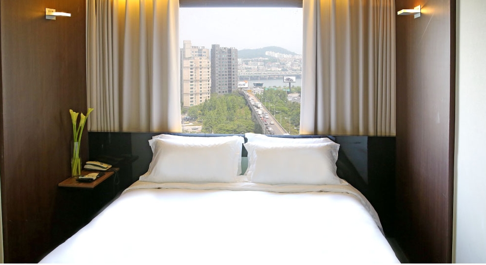 객실에서 저 멀리 한강이 보여요. 외관은 깨끗한데 객실은 좀 오래된 티가 납니다. 침대는 푹신하고 좋았는데 객실에 있는 다른 가구들이 오래된 티가 많이나요. 다른사람들 리뷰처럼 이불에 꿉꿉한 냄새나면 어쩌나 걱정했는데 제가 배정받은 객실에는 꿉꿉한 냄새는 나지 않았어요. 화장실과 세면대 샤워시설이 같이 되어 있는데 너무 좁고, 샤워하고나면 변기가 다 젖어요.