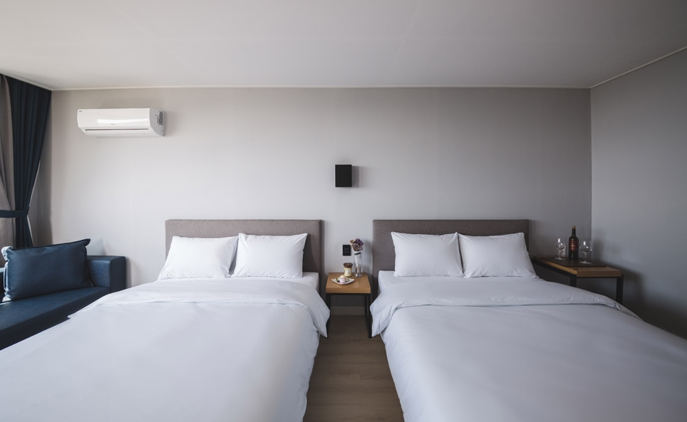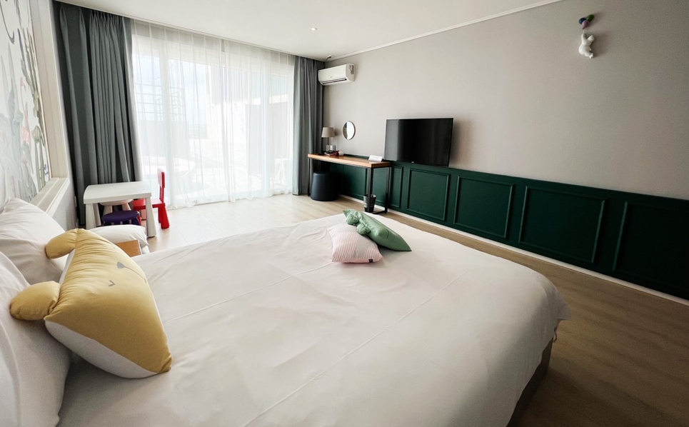 객실도 깔끔한 편 이였고 2층에 세탁실도 있고, 3층 지냈는데 탕비실이라고 해야하나요 전자렌지 젖병소독기 가스렌지도 있는거 같았어요 직원들분도 친절했구요! 근데 바다 근처고 흐리고 비올때 가서 그런지 방이 엄청 습하긴 했어요..ㅎ 그래서 복도에 제습기도 있는거 같더라구요 그래도 가성비 좋고 만족해서 다음에도 또 갈 생각 있습니다