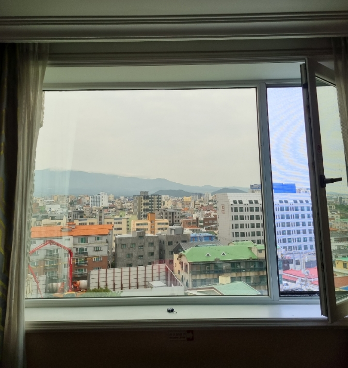 현재 있는 서귀포 인데요. 가격대가 비슷한 서귀포 시내와 가까운 호텔은 세탁기가 있어서 간단히 빨수 있어서 좋아요. 냉장고도 쨩커요. 잘 찾아보시면 좋은 시설 있어요. 여긴 진짜 별루에요 창은 크고 뷰는 시내라 볼거 없어요. 글구 저흰 인천 도시에서 와서 시내 전망 별로 관심 없구요. 창틀 청소좀 하세요. 제발 청결.청결.청결.아 더러워요