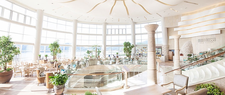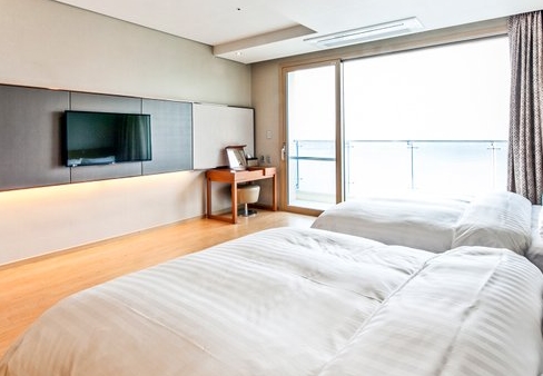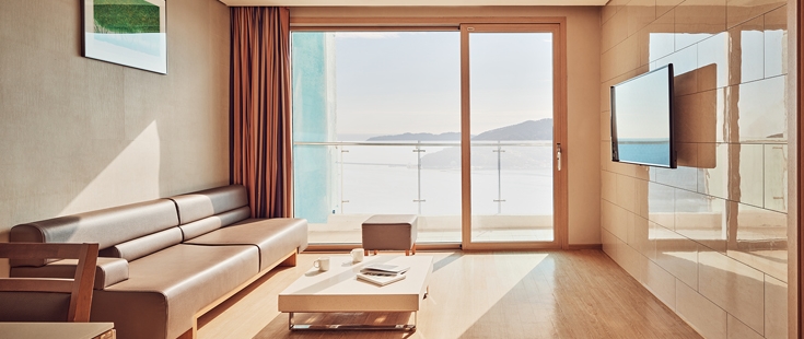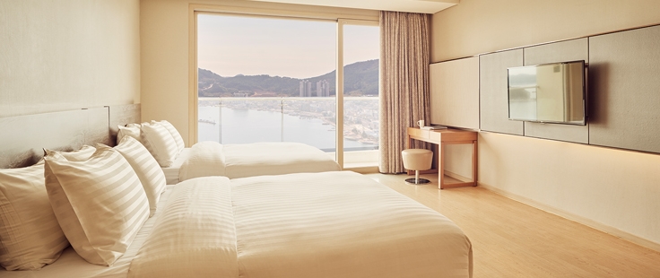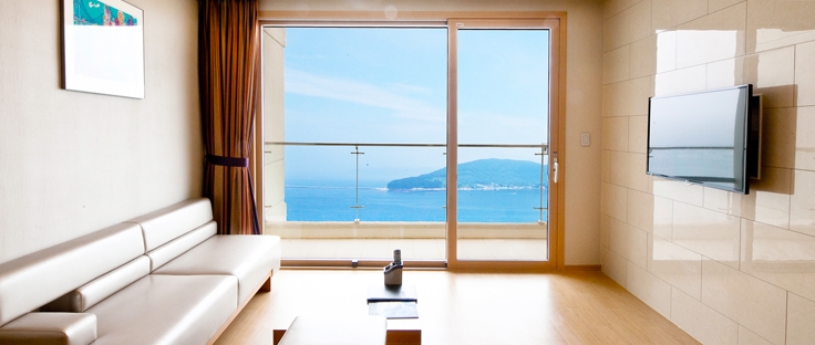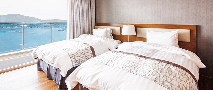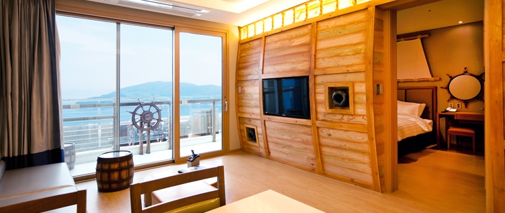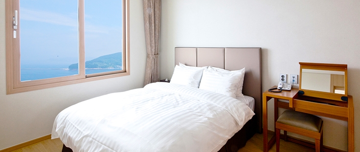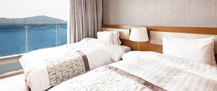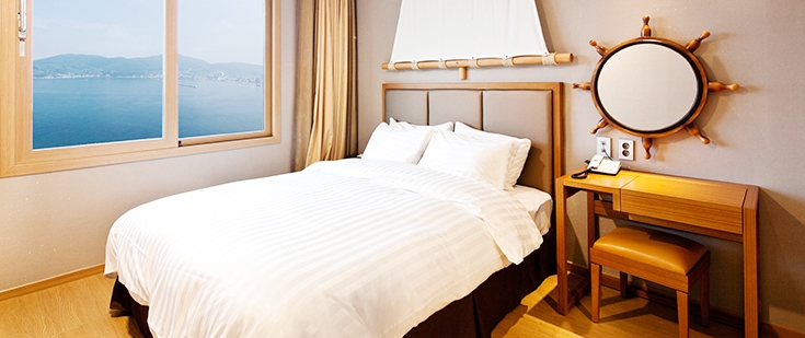 전 객실 한려해상국립공원이 보이는 오션뷰가 특징으로 쪽빛 바다 빛이 압권입니다