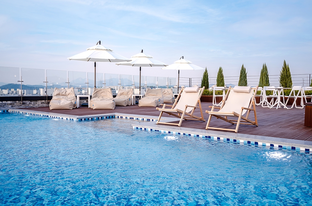 공항과 가까운 위치고 교통도 편하고 주위에 먹거리 백화점 다 있어서 편하게 있었습니다 첫날은 비가 많이 와서 수영 못하고 둘째날은 비가 조금 오긴했지만 잠시 수영했는데 너무 재밌게 놀았어요~ 날씨가 좋았으면 더 좋았겠지만 그래도 가성비 좋은 수영장 있는 호텔이었어요! 수영 대신 조식 한번 먹었는데 조식도 넘 만족스러웠어요! 방 크기도 너무 작거나 좁지도 않고 넉넉했어요 재방문 의사 있습니다~