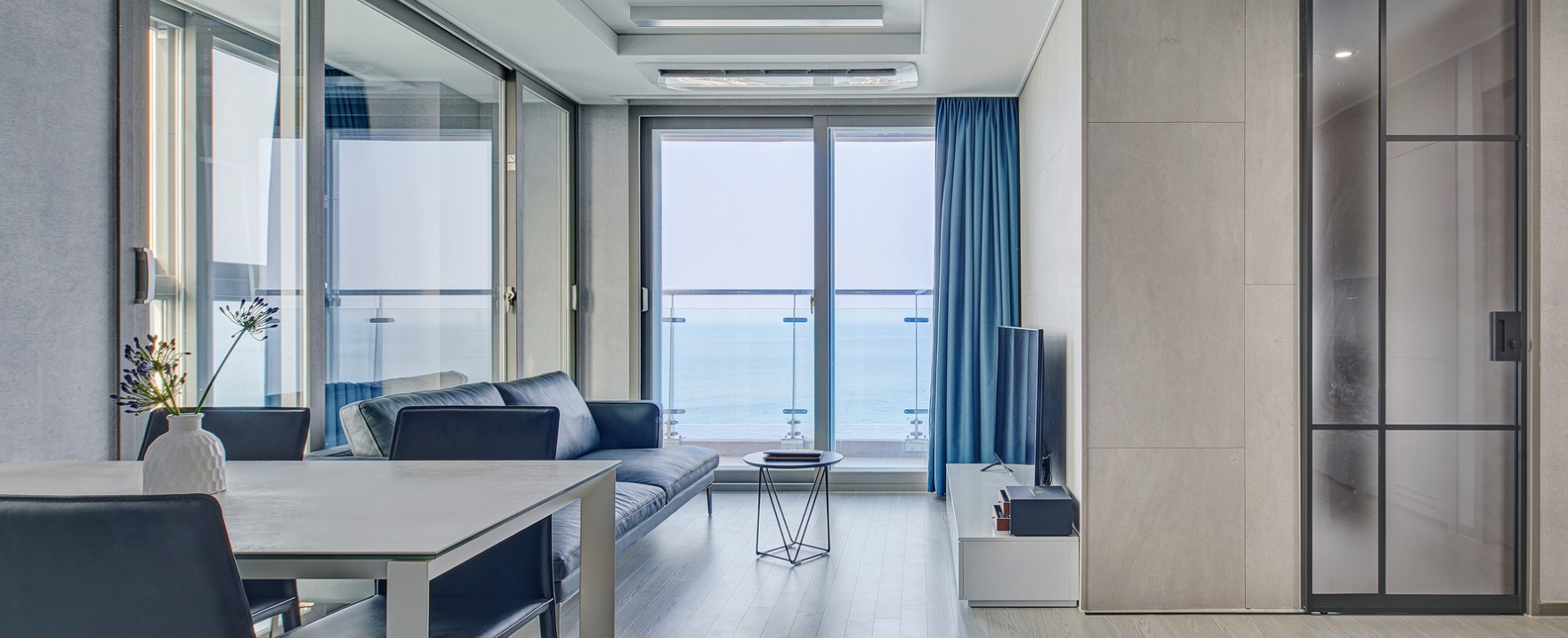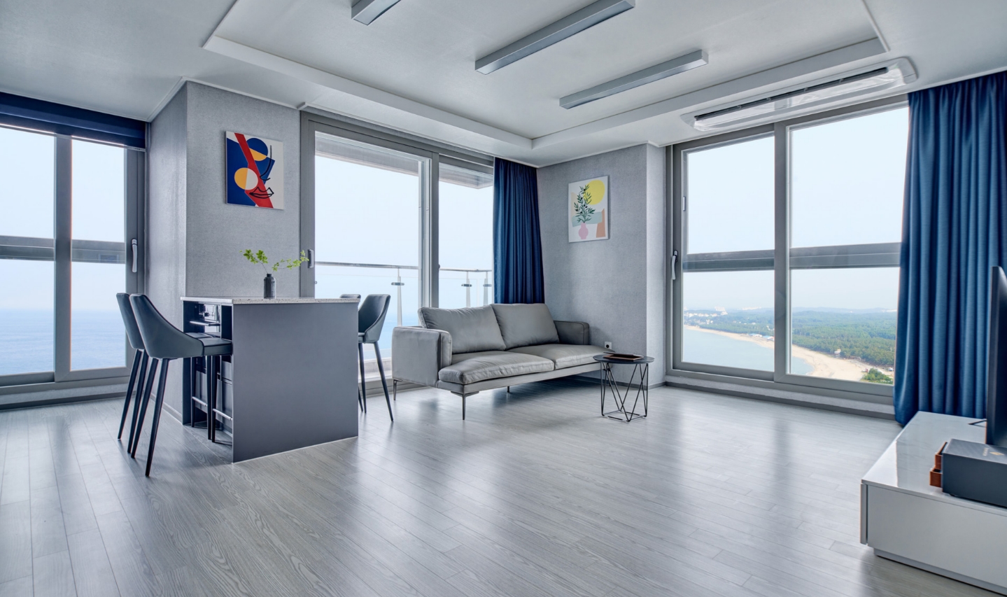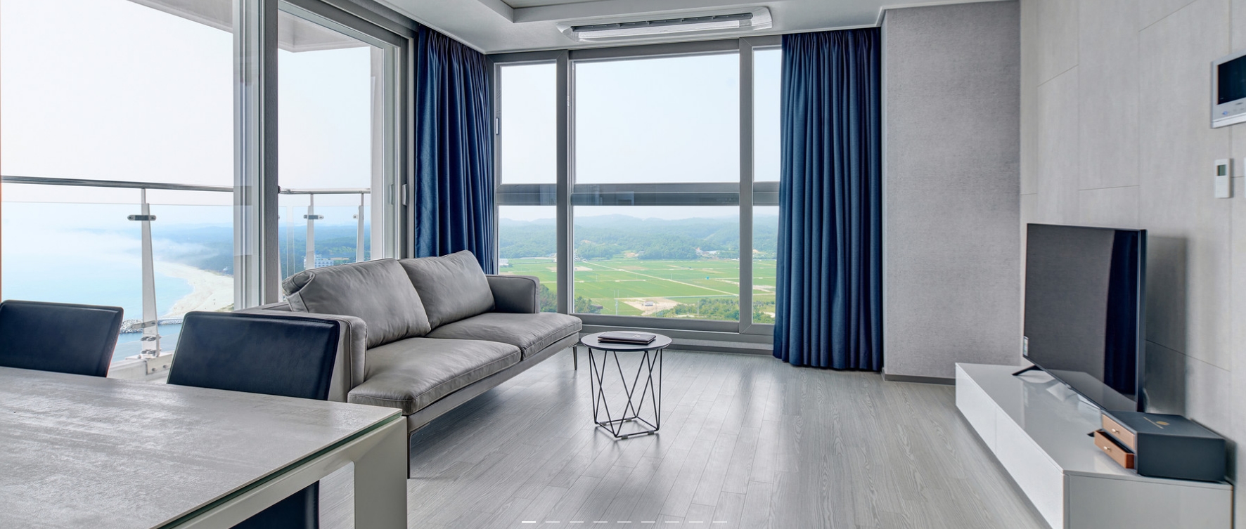 동해바다가 파노라마처럼 펼쳐져 있는 서핑의 메카 사천 해변에 위치한 컨 피네스 오션 스위트입니다