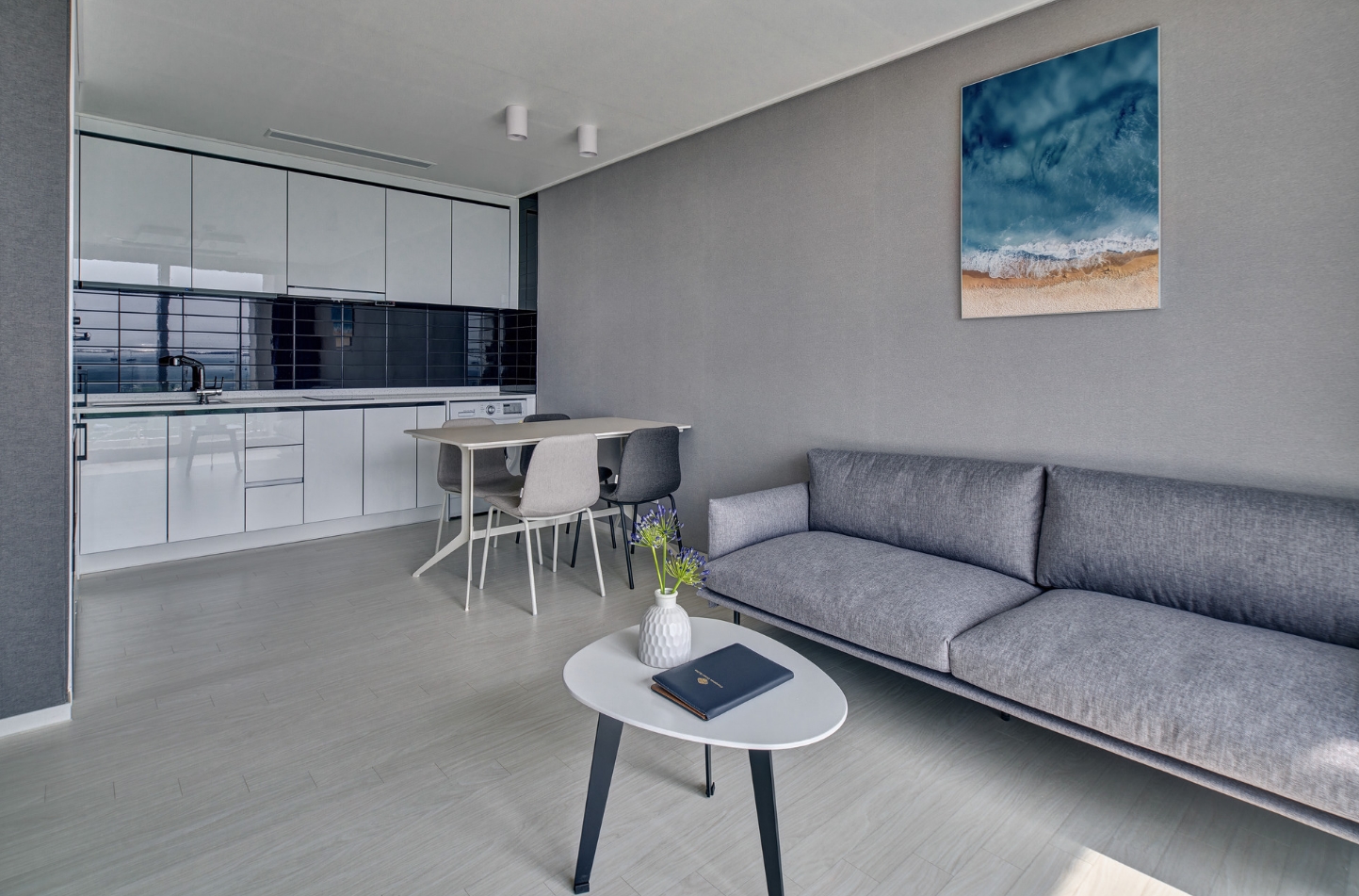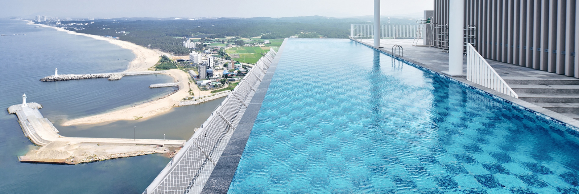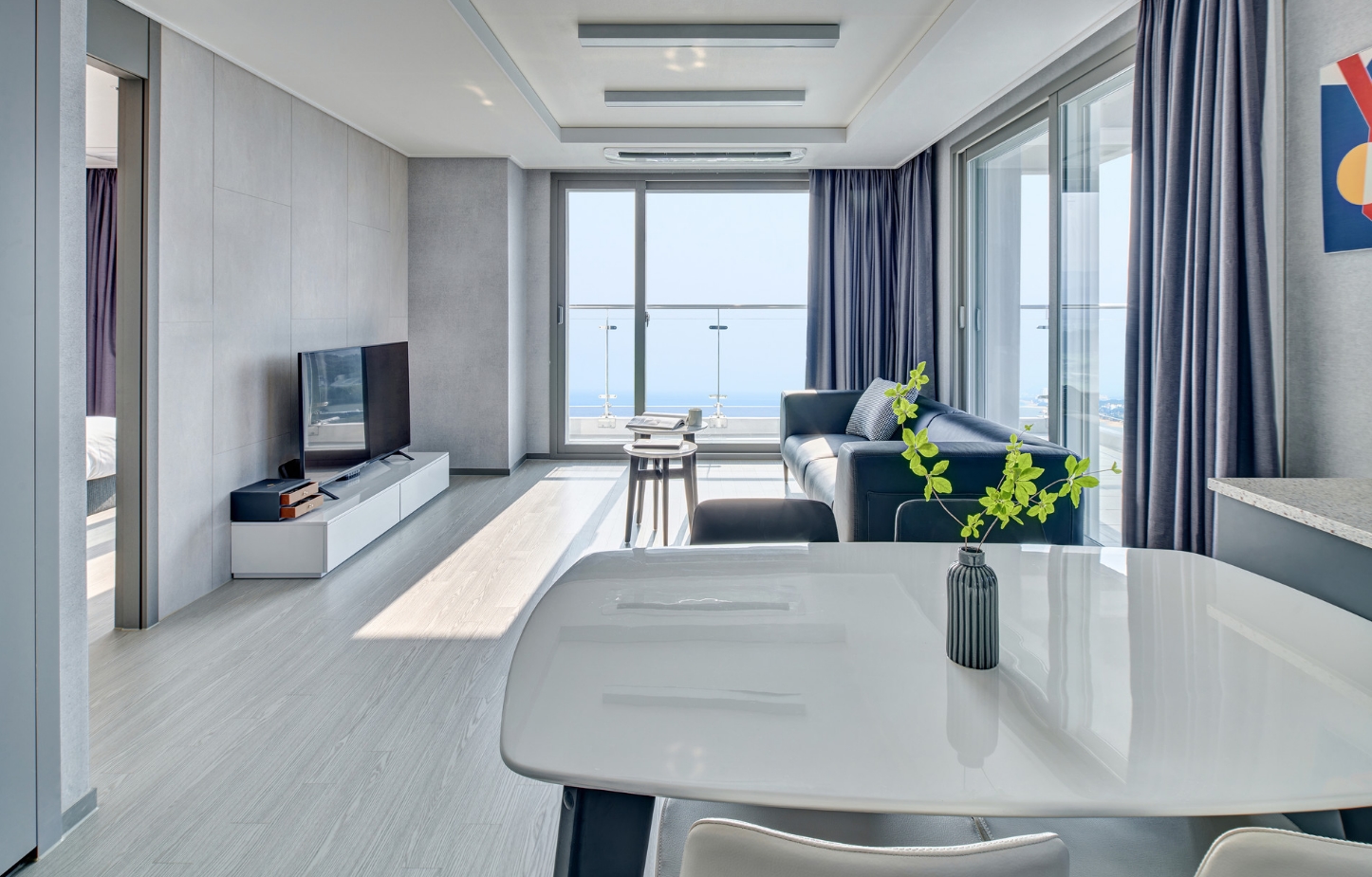 동해바다가 파노라마처럼 펼쳐져 있는 서핑의 메카 사천 해변에 위치한 컨 피네스 오션 스위트입니다