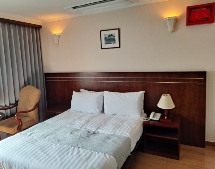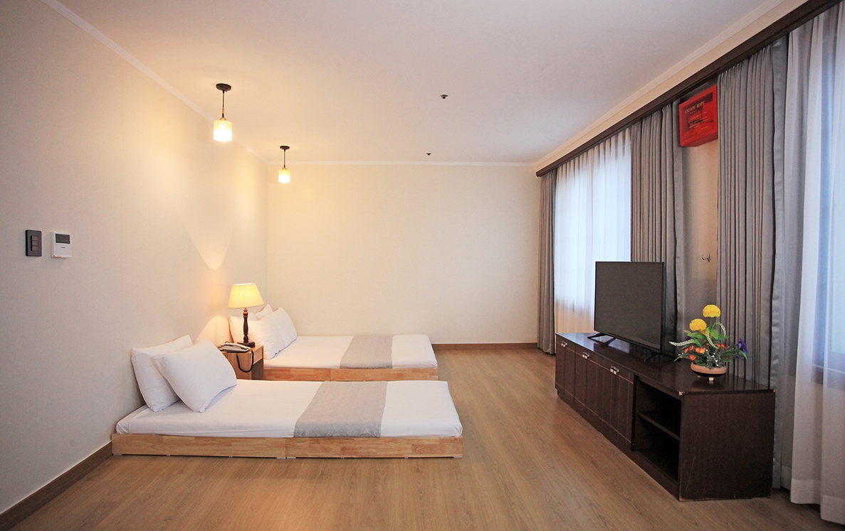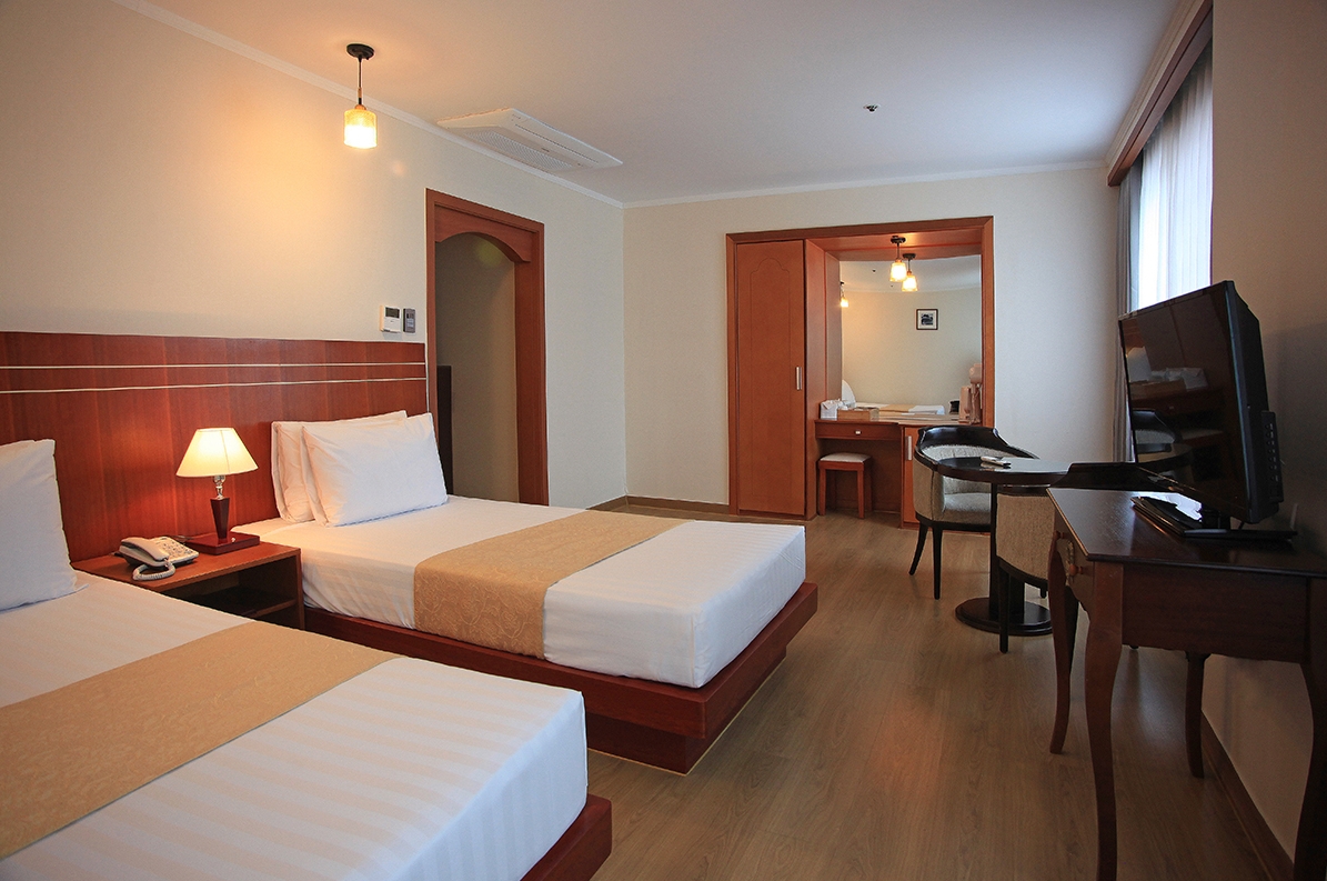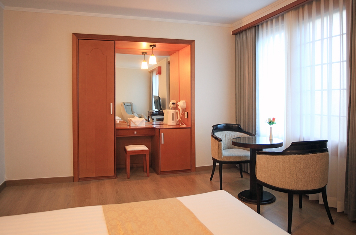 디럭스 트윈 (성인 3명 사용, 추가 요금 지불 했음) 이 예약했고, 평일 저녁에 체크인 했는데 한실 스위트로 업그레이드 해주셨어요~ 방 키 하나랑 큐알코드로 도어락 열 수 있게 해주셨지만 ...큐알코드가 읽히지 않더라구요;;;;체리 몰딩에 비치된 가구에 세월의 흔적이 있었지만 대체로 깔끔 했습니다.