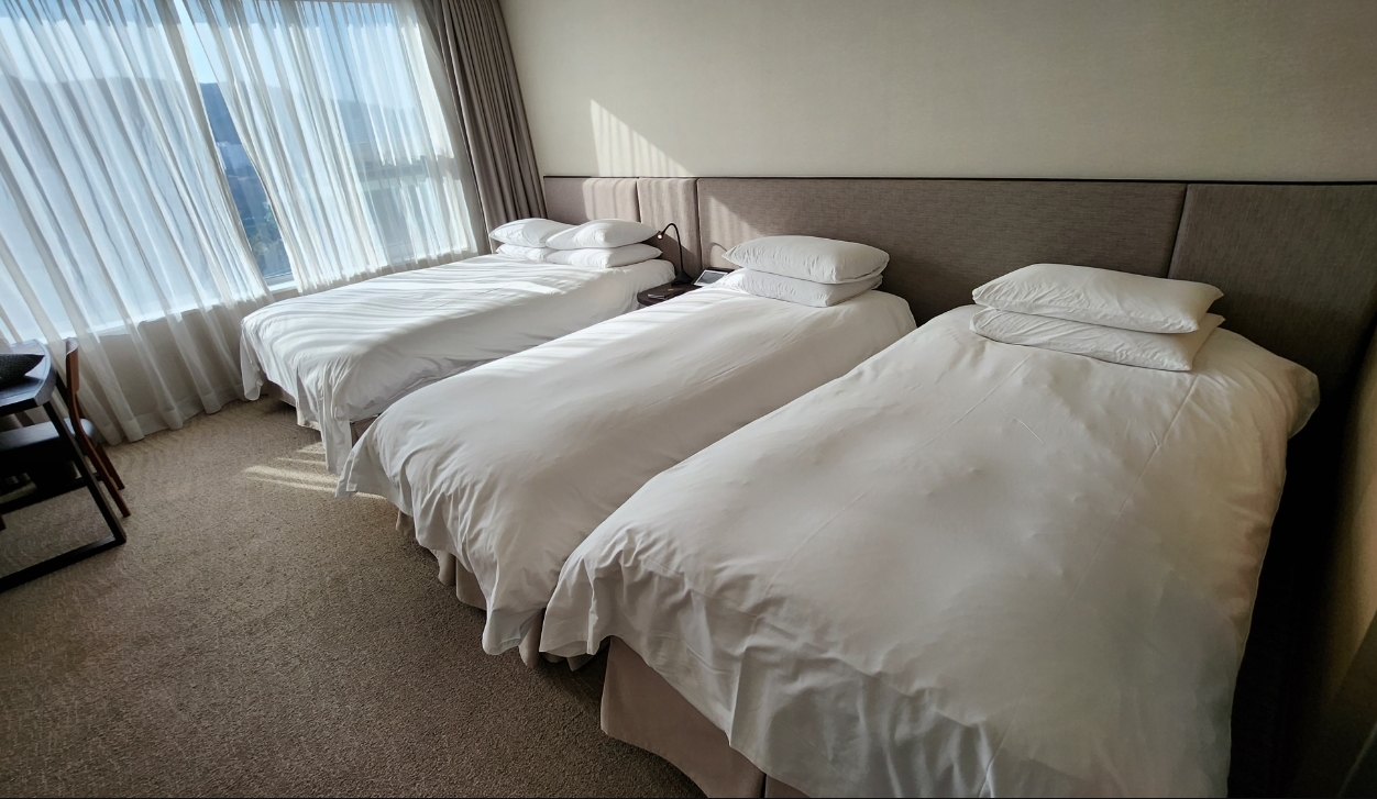 객실 바닥 카펫 그리고 침구류 등 머리카락이랑 먼지가 있어서 많은 객실 관리가 쉬운건 아니겠지만 조금 위생상 문제도 있으니 신경을 쓰셔야 할 꺼 같아요. 침대는 더블 베드 치고 꽤 큰편이라 편하고 객실 내부 조명이 있긴 한데 다 켜도 그렇게 밝지는 않아요~ 은은 합니다. 그리고 차 없으면 외부 편의점이나 이런건 나가기가 꽤 번거로우니 체크인 전 필요 하신게 있으면 구매 해서 들어가시는게 편리할껍니다. 재방문 의사는 60% 입니다. 5성급 치고 가격적인 메리트는 있으나 노후된 시설 및 객실 청결 상태 등 아쉬운 점이 있는건 명확 합니다.