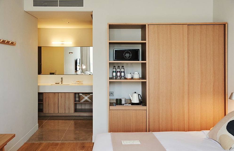 스탠다드 더블 베드라서 좋았음. 샤워기와 변기가 슬라이딩 중문 안에 따로, 세면대는 현관문 바로 앞에 나와있음.