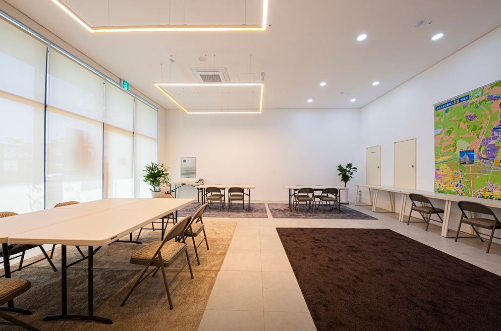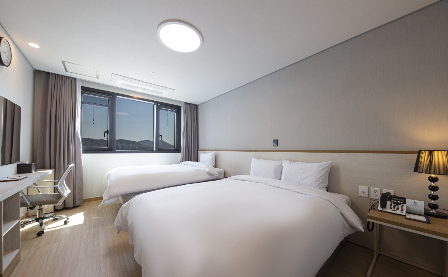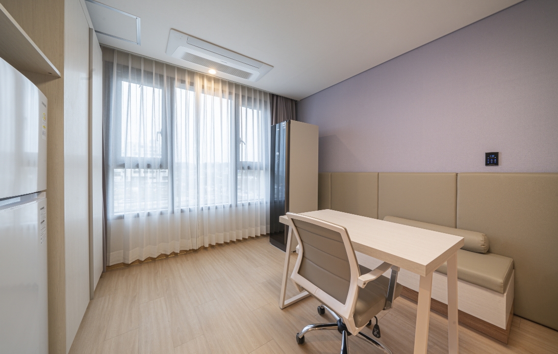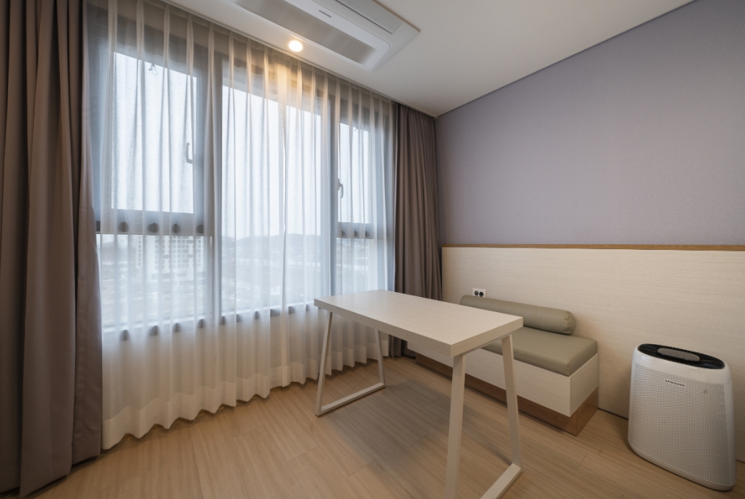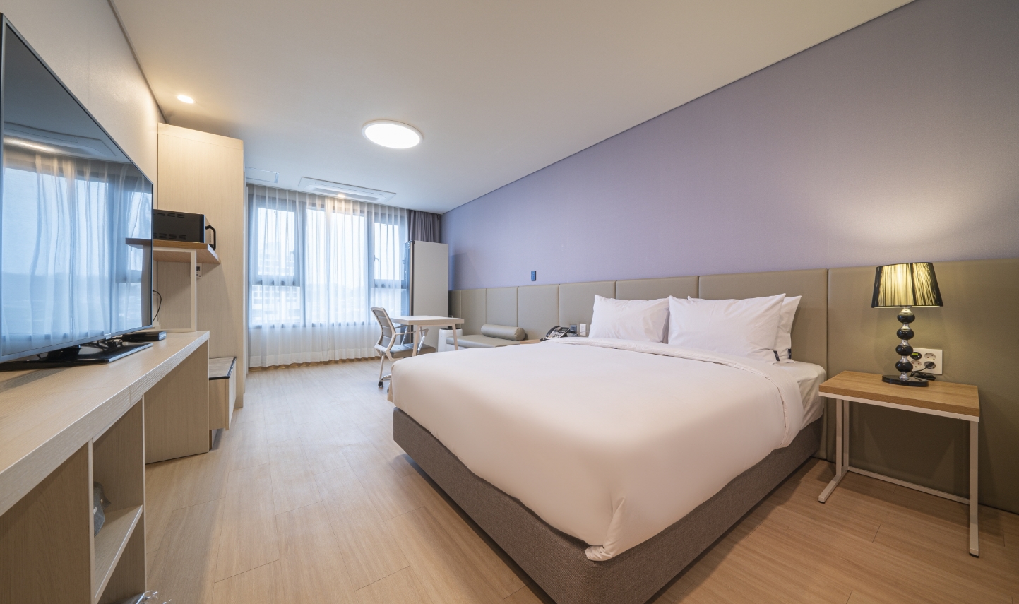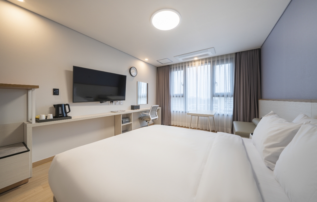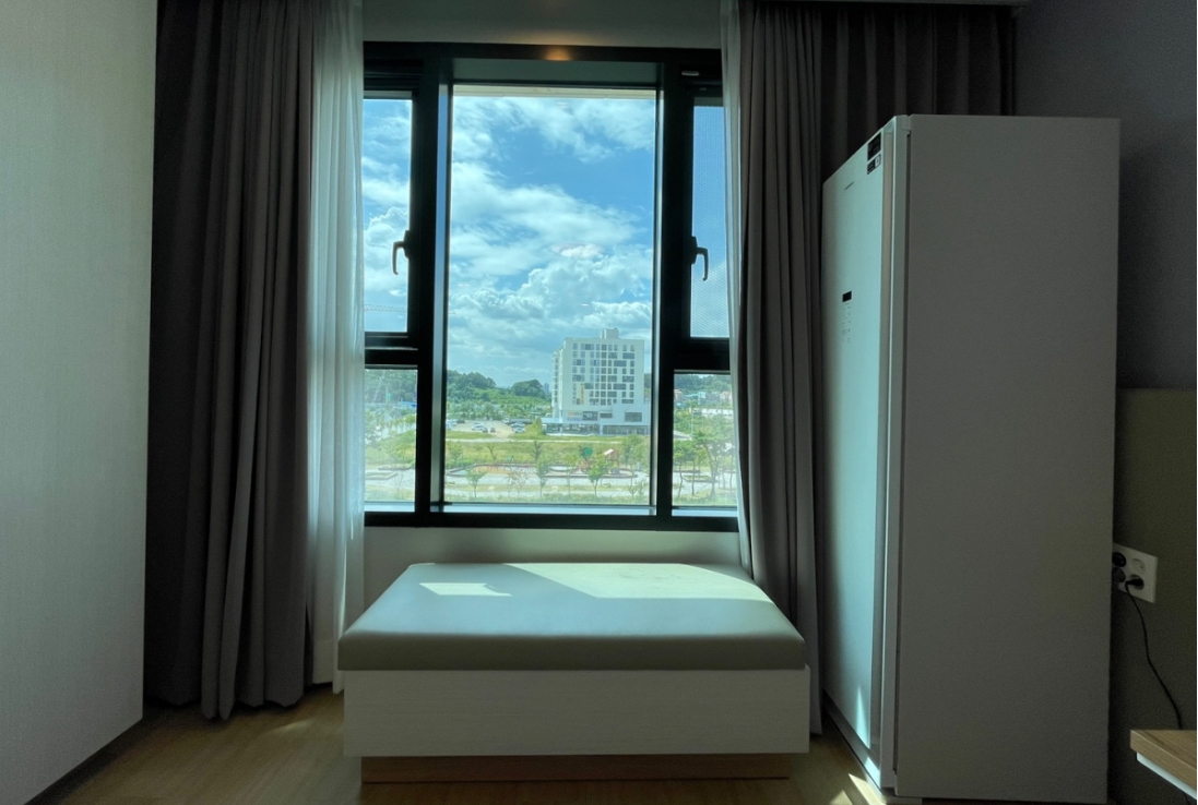 방안에 커다란 티비 냉장고 공기청정기 헤어드라이기 전자렌지 등 가전기기가 많고 깨끗해서 이용하기 편리했습니다. 생긴지 얼마 안됐는지 시설이 좋고 깨끗한데 주변은 아직 공사중이라 뷰 생각하시고 묵는곳은 아니구요. 근처 관광지 가기전 하루 묵거나 비지니스하시는 분들이 묵기에 좋을것 같아요. 노트북같은 간단한 작업하기에 편리하게 작업공간과 의자도 비치되어 있어요. 저는 지중해마을 방문하려고 하루 묵었는데 걸어서 10분정도 거리라 가깝고 깨끗해서 하루 잘 지내고 갔습니다.