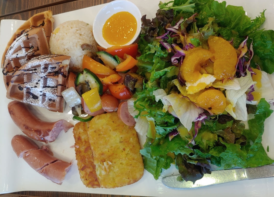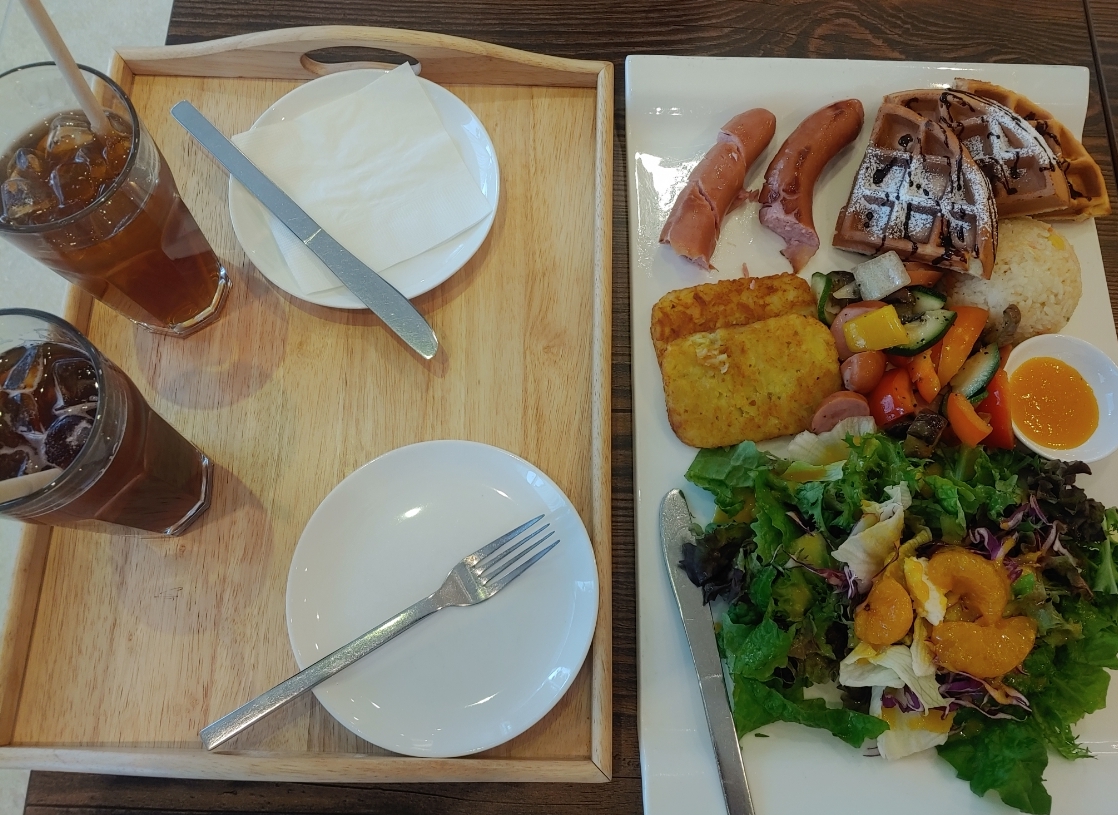 뭣보다 맘에 들었던 것은 바로 조식입니다. 샐러드, 새우볶음밥, 소시지, 해시브라운, 와플과 귤잼? 등 맛난 음식이 커다란 접시에 담겨 제공되는데 야자수가 보이는 창 밖을 보며 즐길 수 있는 조식은 최고였습니다.