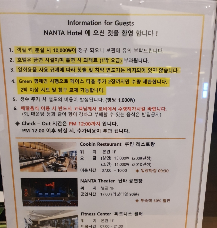 1)투숙객 50% 할인이라고 해서 와서 공연 예매를 했더니 좋은 자리가 안 남았습니다. 안내장보니 네이버에서도 미리 50% 할인이라하니 거기서 미리 예매하고 오시는게 날 거 같습니다