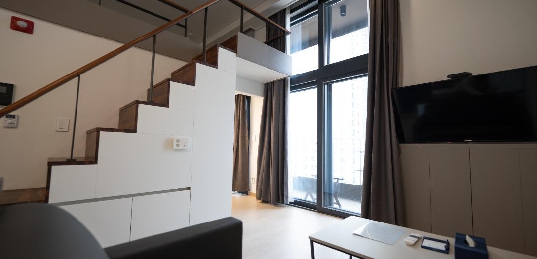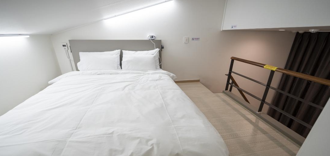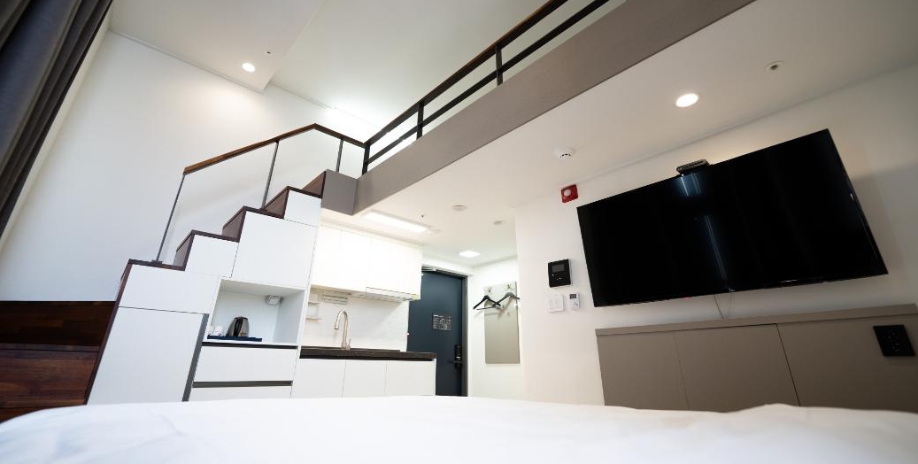 듀플렉스 더블 예약 하신 분 a.b형으로 배정됩니다. a형 어이없게 1층에 딱 더블베드 하나만 있습니다. 복층에 아무것도 없어 방에서 음식은 물론 못드실꺼고 쉴때도 침대에 누워 티비든 뭐든 해야합니다. 여유공간없음...b형으로 바꿔야 사진처럼 1층에 쇼파와 테이블 티비가 있고 복층에 침대있습니다. 원하면 배정 받고 바로 바꾸세요. 나머진 그냥 이용시 불편함은 없었고 가까운 곳에 맛집이나 도보로 이용 가능한 곳 많습니다.