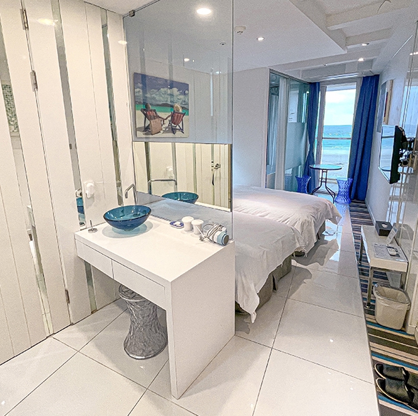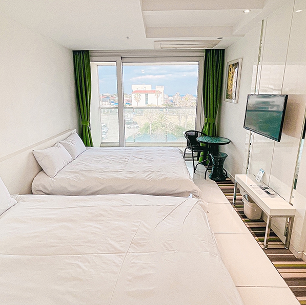 같은 건물을 두 곳에서 운영하는것 같아요. 카운터가 두 개에요! 우선 여기는 함덕해변에 다른 오션뷰 호텔과 비교하면 가성비 최고입니당!! 문 열면 바로 바다가 보이고 테라스도 있어서 좋아요~욕조하고 화장실도 따로 있고 욕조에선 바다도 보입니당. 공간도 잘 구분되어있고 방도 넓은 편인데 트윈룸이라 침대 두 개 있어도 캐리어도 열어놓을 수 있고 넉넉합니다. 친구랑 여행했는데 두명이서 쓰기에 충분해요ㅎㅎ청소도 매번 청결하게 잘 해주시고 깔끔해요!!