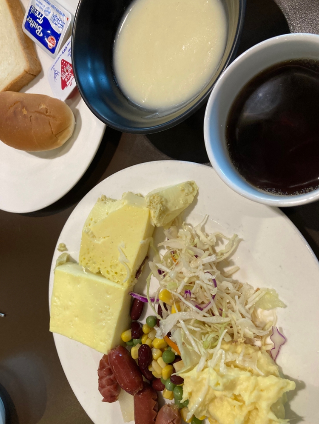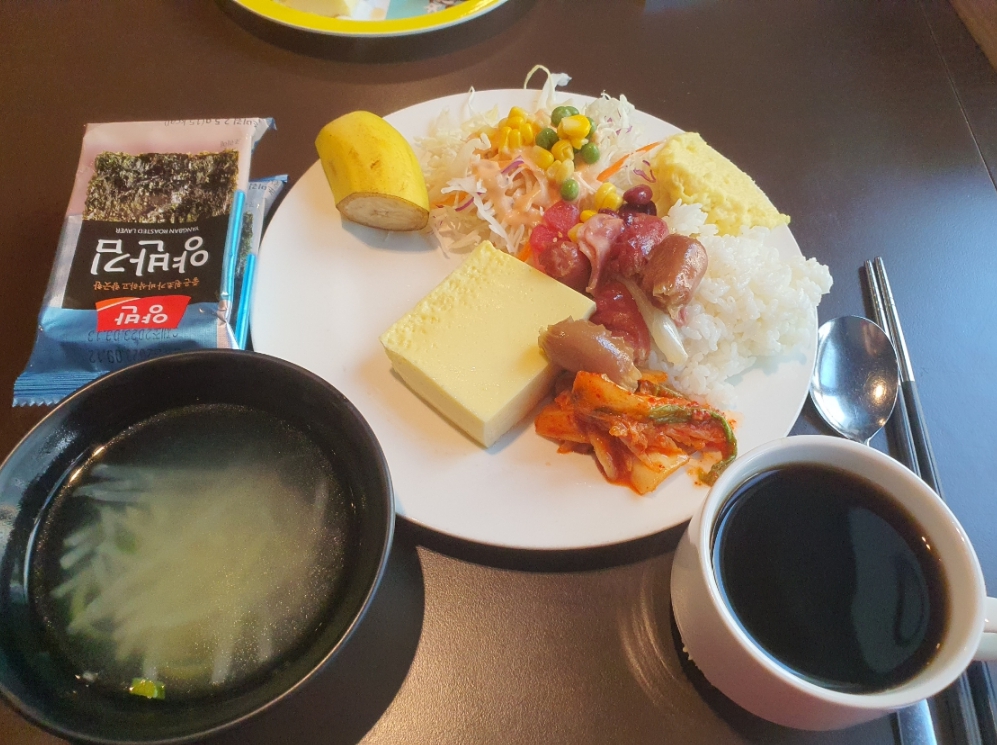 그리고 조식! 쌀 밥, 국, 부드러운 계란찜, 소세지야채볶음, 콩 및 콘샐러드, 김치, 장아찌, 스프, 김과 콘프레이크 우유, 빵, 오렌지주스, 야채샐러드, 감자샐러드, 후르츠칵테일? 정도 있습니다. 근데 먹기 부담스럽지 않고 딱 좋은 구성들이라 꼭 먹습니다. 다만, 이번에 저희는 설날에 이용했는데, 사람이 너무 많은데 비어있는 음식들의 대기줄이 길어서 빠른 회전이 안됐던 점이 살짝 아쉬웠네요.
