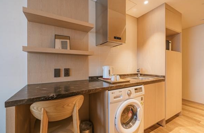 객실에 드럼세탁기가 배치되어 있어 세제만 프런트에서 구입하면 사용 가능하고 건조대까지 무료로 이용할 수 있어 편리합니다 호텔 주변 식당과 편의점들이 있어 도보 이용 가능하여 편리합니다 친절하고 가격 저렴하고 이용하기에는 추천하고싶고 다음 여행시에도 재방문 의사 있습니다