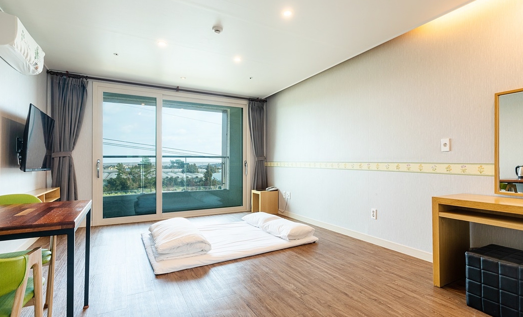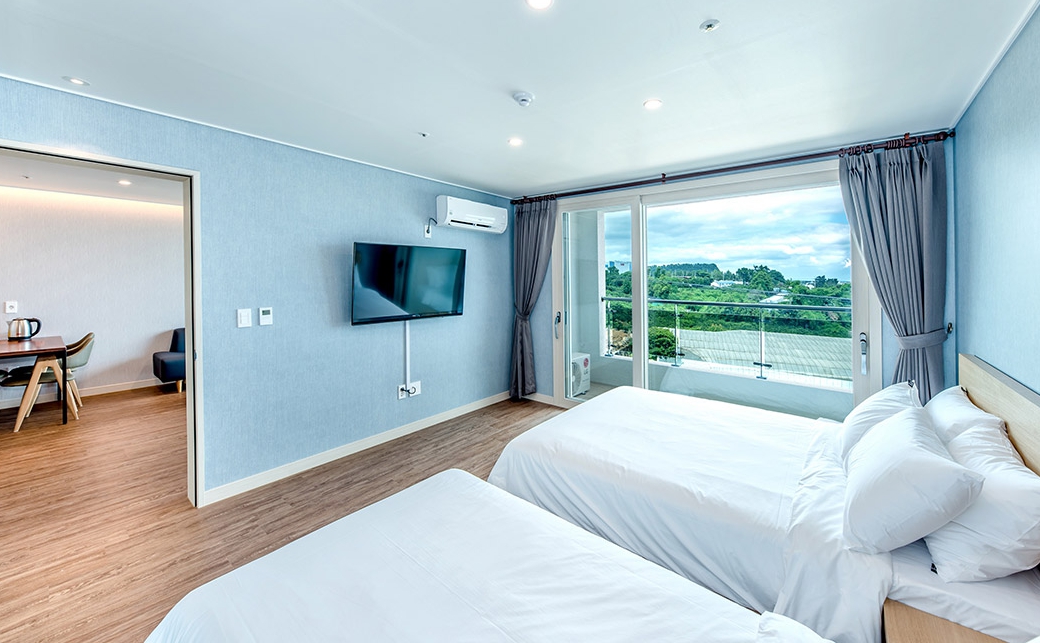 아이와 함께하는 여행 둘째날 트윈배드로 선택했어요 찾아가기 편하고 주차하기도 편했어요 침구 상태도 깔끔하고 욕실 상태도 좋았어요 (수압이나 따뜻한 물) 싱크대가 있어 기본 컵이나 접시가 준비되어있고 올래시장가서 음식을 사와서 먹었어요