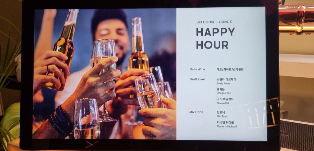 해피아워는 두 곳에서 이용할 수 있었어요. 블루캐니언 또는 스키하우스라운지. 두 곳 다 17시ㅡ21시까지 이용 가능하고, only 주류만 무제한 제공이에요. 특별히 제공되는 스낵 핑거푸드는 없어요. (겨울에 아프레스키인가? 거기에선 핑거푸드 제공 되었었는데..이번 시즌부터 바뀌었대요) 저흰 스키하우스라운지 이용했어요.