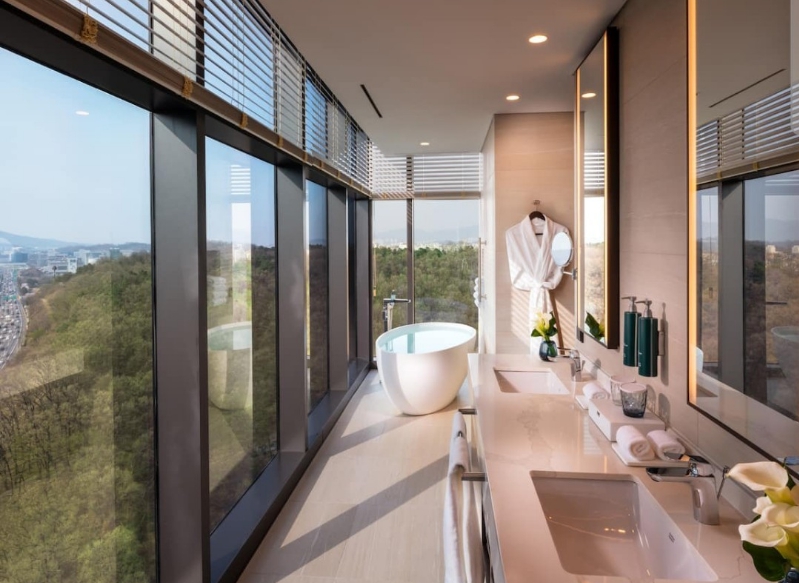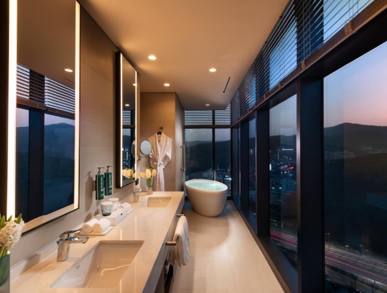저는 객실보다도 욕실이 더 좋았습니다 코너형 객실이라 개방감이 엄청 좋고 전망도 완전 굿! 호캉스나 힐링을 위해 예약하시는 분들은 프리미엄 코너룸 추천드려요 어메니티는 일회용이 아닌 디스펜서 형태였고 제품 자체는 좋았습니다 오픈하기 전부터 궁금했었는데 기대 이상으로 만족스러워운 호캉스였습니다 재방문해야겠어요
