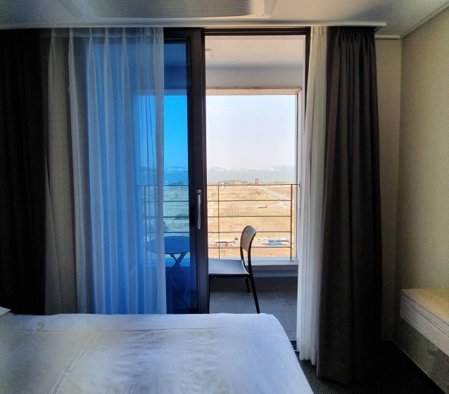 바다가 멀지만 야경 좋아요. 전화 받는 여자 직원분 매우 친절하십니다. 프론트에 가면 좌,우 운영하는 회사가 다르고 에어포트 우측 프론트에서 체크인 하면 됩니다. 평일 15시 기준 주차는 가능한데 80% 이상 주차 상태였고 주차장 2층, 3층에 기계식 주차장도 있어서 이용 가능해 보였어요. 시티뷰 쪽은 바로 앞 오피스텔 공사중이라 아침부터 소음 발생할 수 있어요