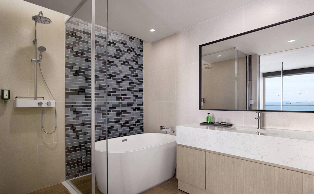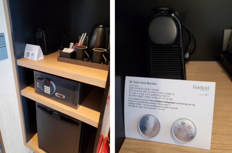 커피스틱과 커피2종류 티 3종류 비치되어 있고 욕조는 없어요ㅠㅠ 공간이 좁아 의도한 인테리어인지 화장실과 샤워부스가 ㄱ자로 되어있어 사용시 문이 하나라 화장실 샤워부스 쪽 문을 화장실 사용시 그 문을 닫아서 사용해야 해서 한 사람이 샤워 시 룸메가 화장실 사용 또는 룸을 나가기에는 불편한 구조에요 호텔 앞 산책로와 스카이워크 구경갔어요 다시 오고싶은 호텔입니다 추천~~