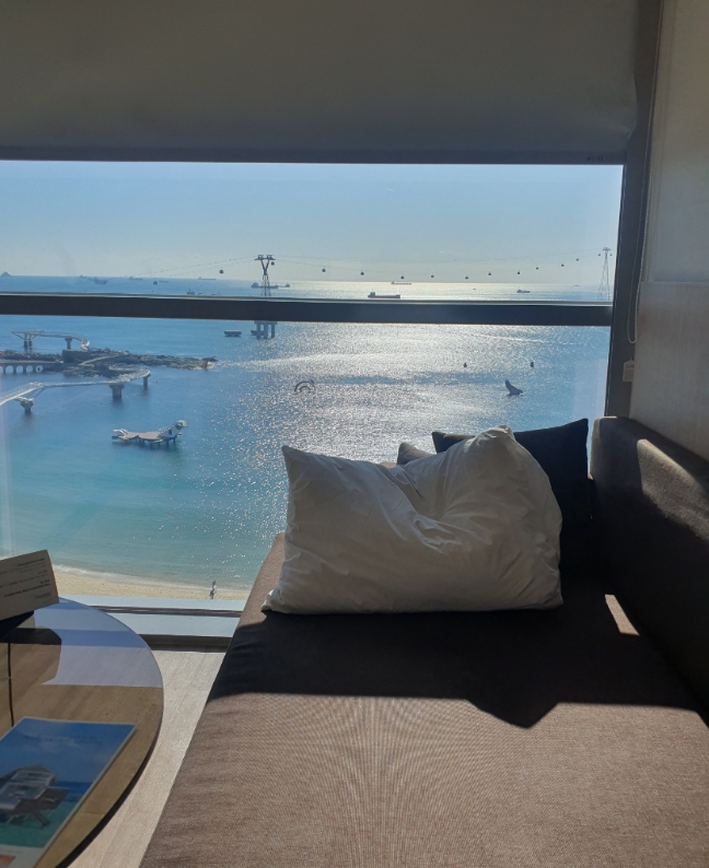 오션뷰 호텔을 찾다가 신상 호텔이라 바로 예약하고 간 곳! 입구부터 깨끗한 느낌에 룸에 들어가는 순간 우와~~~~감탄이 나와요 기존 호텔의 인테리어와는 다른 세련된 분위기가 마음에 들었어요 창가 쪽에 앉아 여유있게 차 마시며 휴식하니 힐링 그자체! 일회용 슬리퍼는 신자마자 찢어져서 아쉽네요