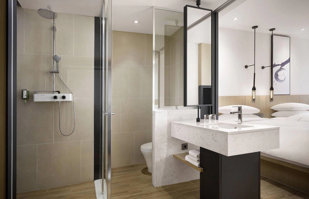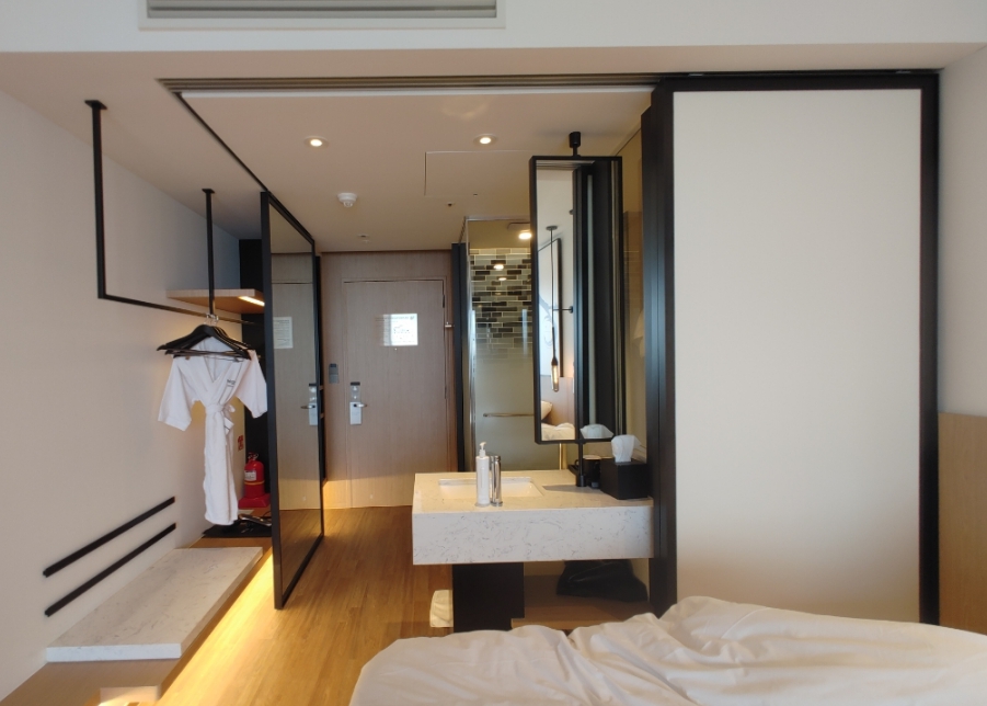 손 씻으면서 오션뷰 감상 가능해요 단 세면대와 침대가 가까워 손 씻을 때 침대에 물이 튈 수 있어요 옷을 갈아입거나 샤워할 때 공간 분리되도록 슬라이딩 도어~있어요 핸드스팀 다리미 있는 호텔은 처음이에요 여행시 옷이 구겨지는데 이런 부분은 센스있네요