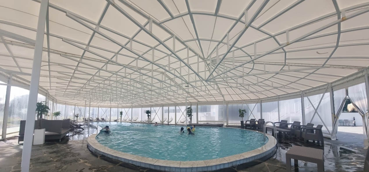평일에 애들데리고 갔었는데 돔 형식의 실내수영장에서 피부가 팅팅 불 때까지 놀았어요 정말 잘 놀고 왔습니다 ㅎ밤에 보니 수영장에 조명도 들어와서 분위기 좋더라구요:-) 뒷날까지도 아이들이 너무 좋았다고해줘서 다음에 한번 더 방문하려구요^^ 수영장 물은 깨끗한 편이엇지만 실내수영장처럼 약간의 락스 냄새 나긴해요 그리고 수영장 바닥에 타일 조금 깨져있어서 보수 부탁드려요 ~