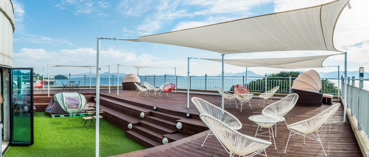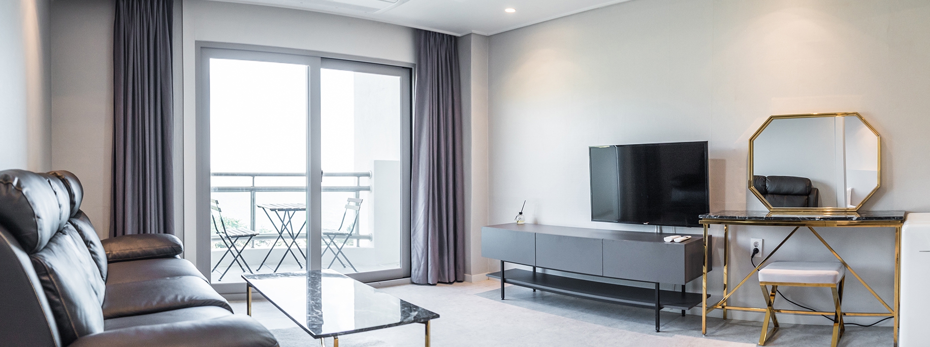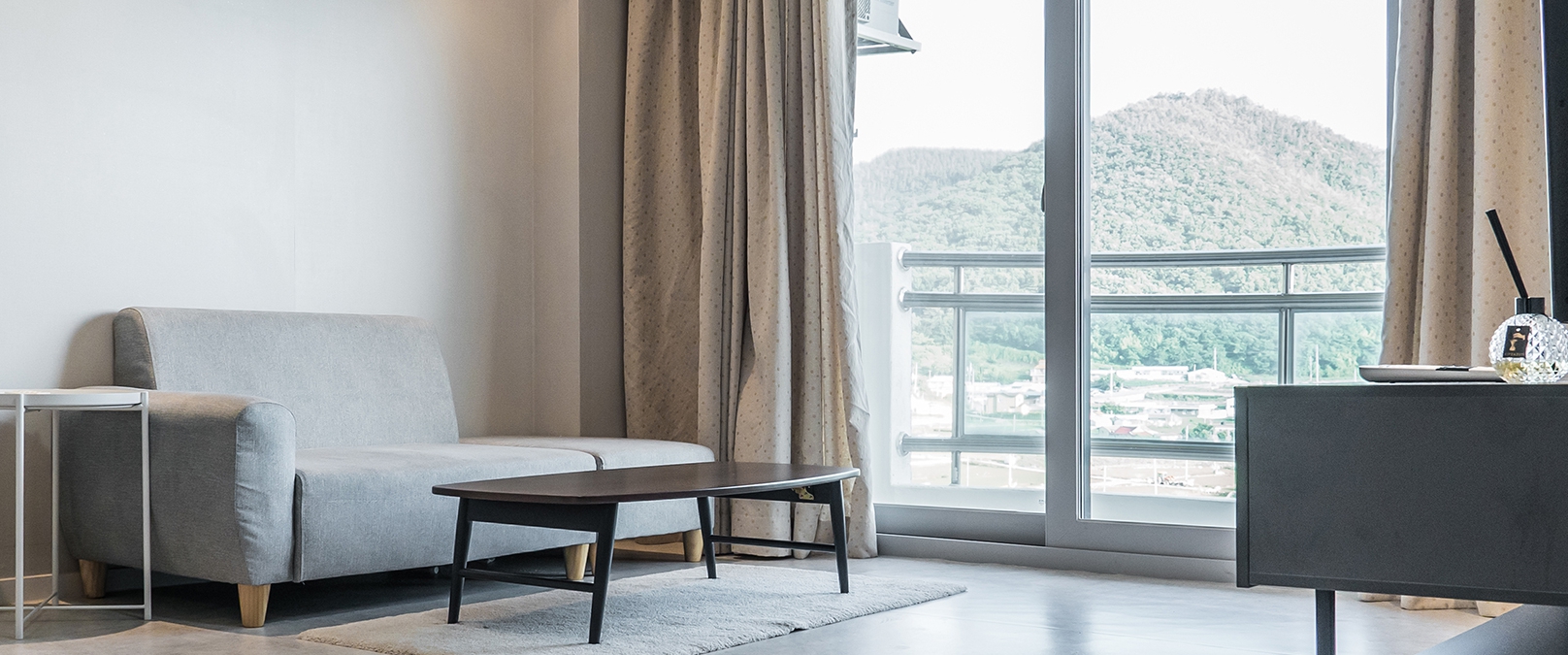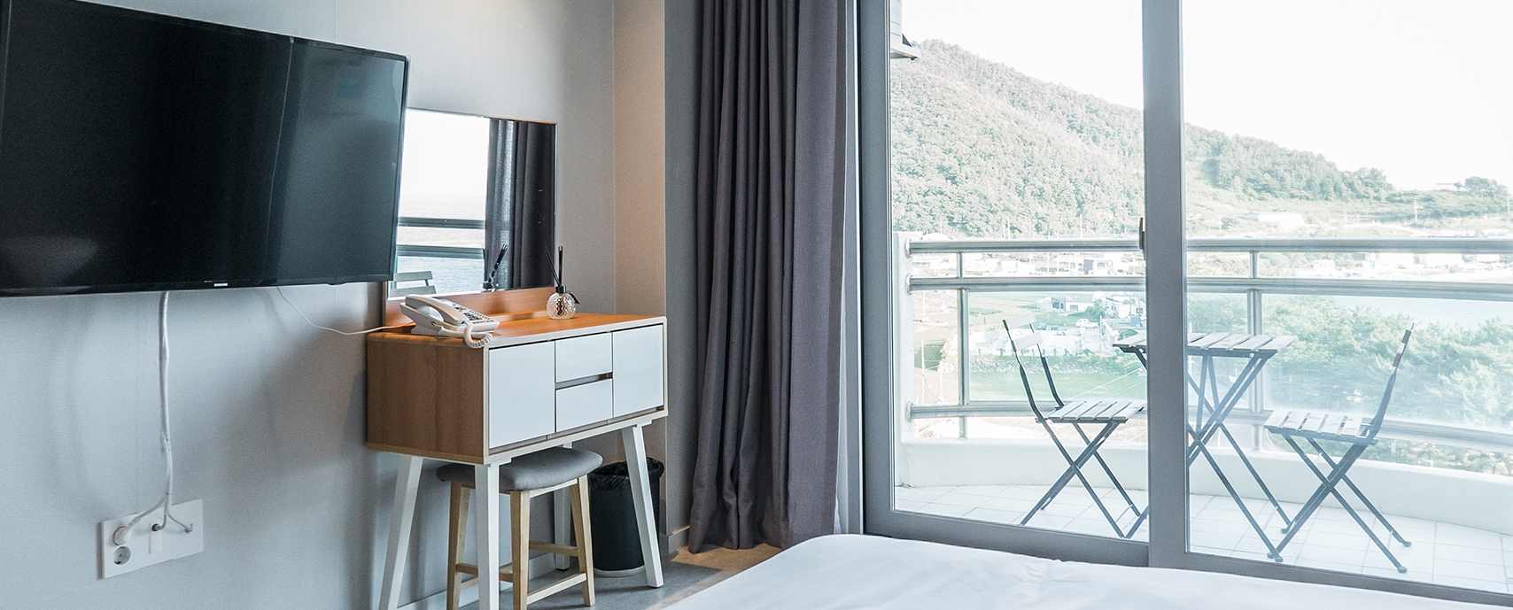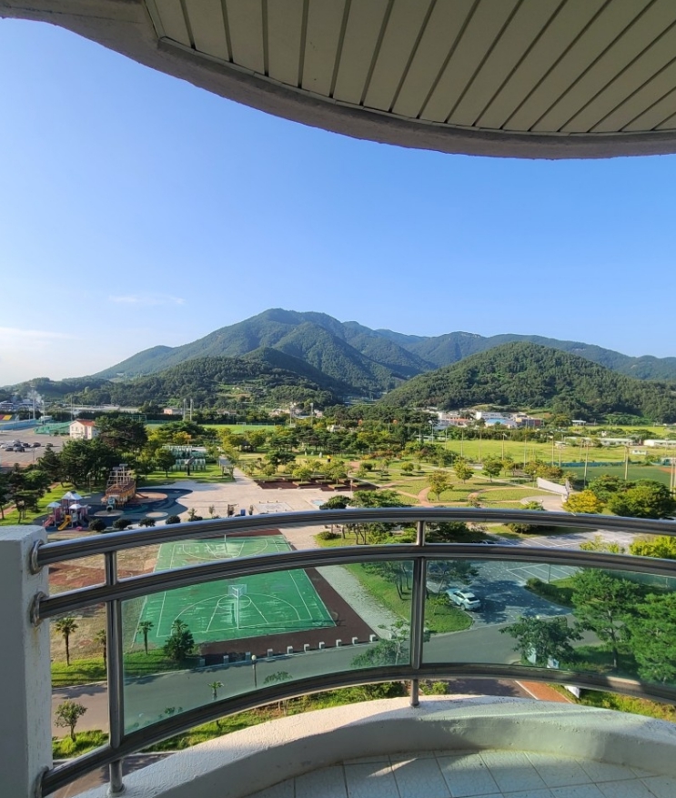 가족이나 단체 등 각종 저렴하게 이용 가능해요 오션뷰로 여수쪽이 보입니다 거실 발코니는 콘크리트로 되어서 시야가 가리는게 단점이네요 방에서는 침대에 누워 바다 보이는데 새벽 쯤 어스름에 깼는데 그때가 좋았어요 밤에는 문 열어두면 앞 해수욕장에서 파도 소리 들려요 작은 방은 창문 없는 타입이라 다소 답답할 수 있어요