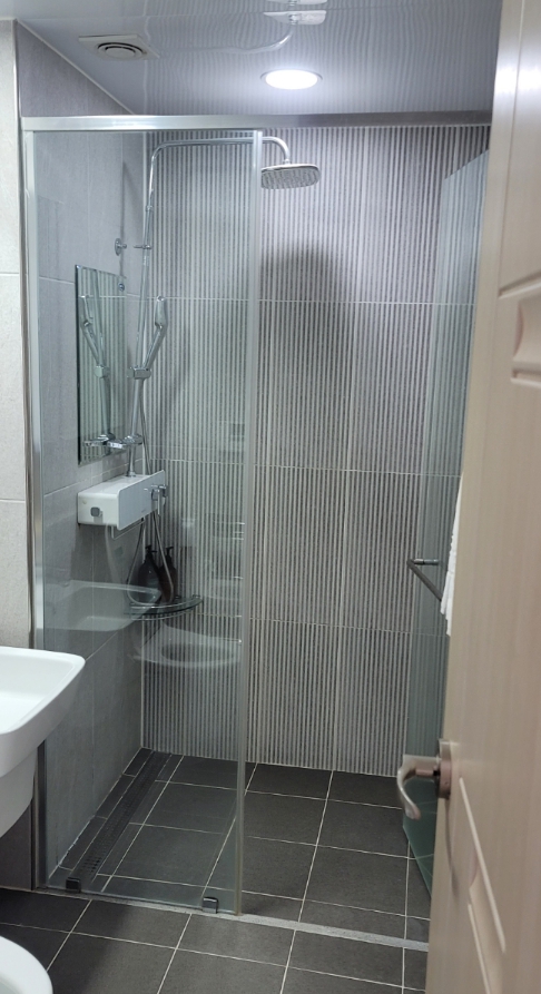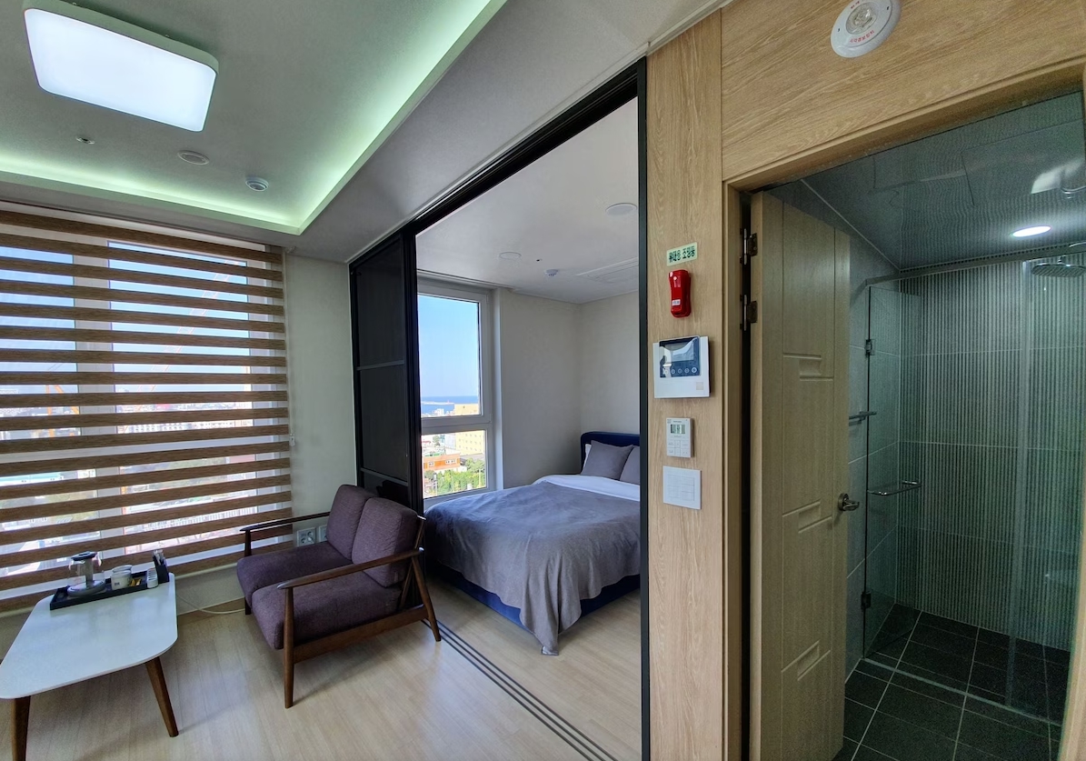 침실이 분리되어 있는 느낌입니다. 거실과 침실 사이에 유리 문이 있어 분리되는 느낌을 줍니다. 침대에 누워서도 TV를 볼 수 있고 창문넘어로는 바다가 보입니다. 침대 머리 맡에는 콘센트와 조명도 있습니다. 수압도 괜찮았구, 다만 아쉬운 점은 테이블이 지저분한 편이었고 티비 쇼파가 다른것들에 비해 좀 낡았다는거? 그리고 뷰가 살짝 아쉬웠어요ㅠ 하지만 전체적으론 만족스러운 여행이었습니다!