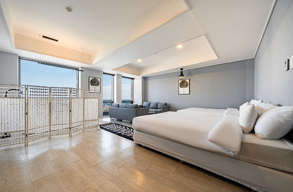 객실 내부 깔끔하고 뭔가 원룸 오피스텔 느낌이 더 많이 났어요. 화장실도 아담하지만 비데도 있고 온수도 잘 나오고 수압도 세고 기본적인 어메니티도 구비되어 있었어요.(클렌징 폼은 없었지만요…) 침대와 이불도 푹신했고 보일러를 틀어놓으면 금방 따뜻해지더라구요. 낮엔 햇빛이 잘 들어와서 보일러를 틀지 않았음에도 불구하고 생각보다 더웠어요 일출 볼 거 아니면 블라인드 내리고 자는 걸 추천합니다 생각보다 엄청 밝아요.