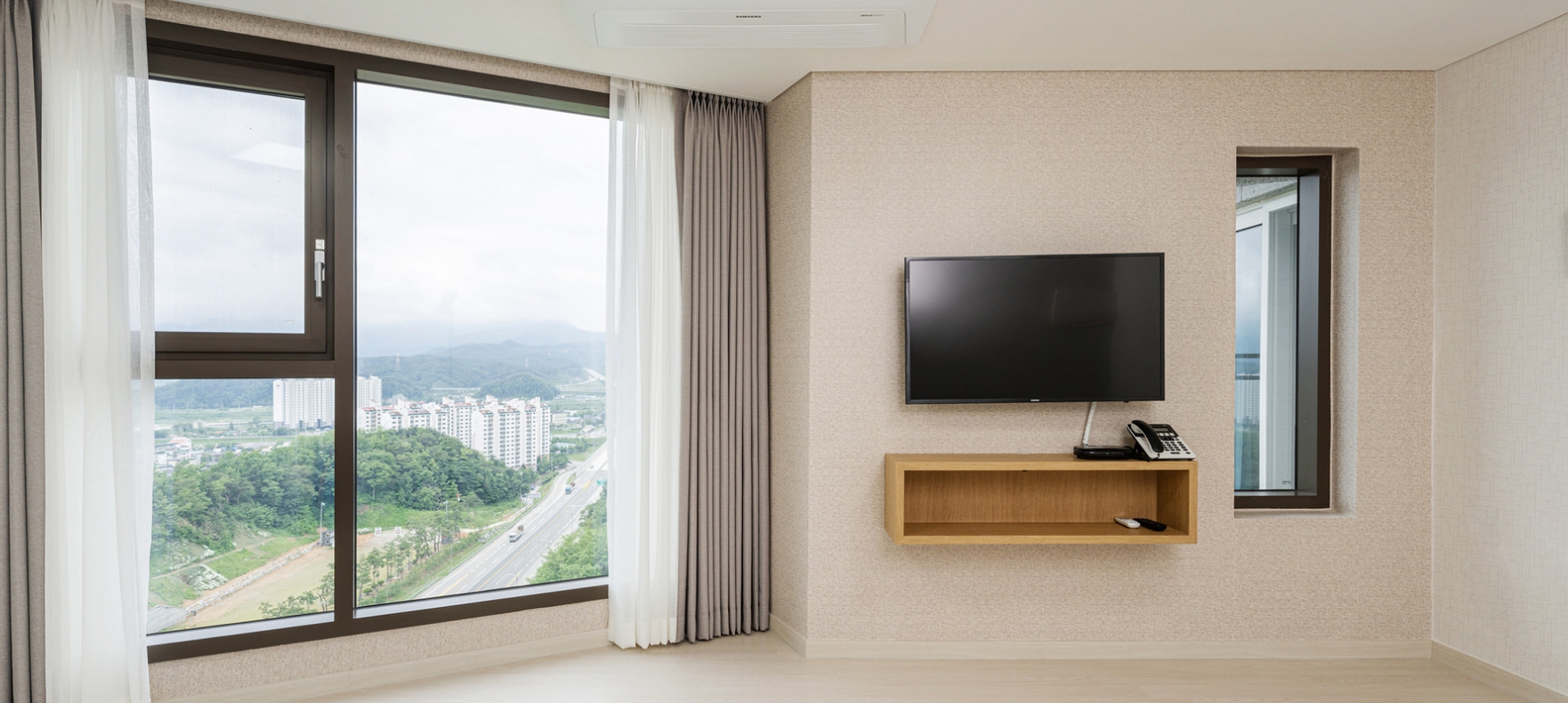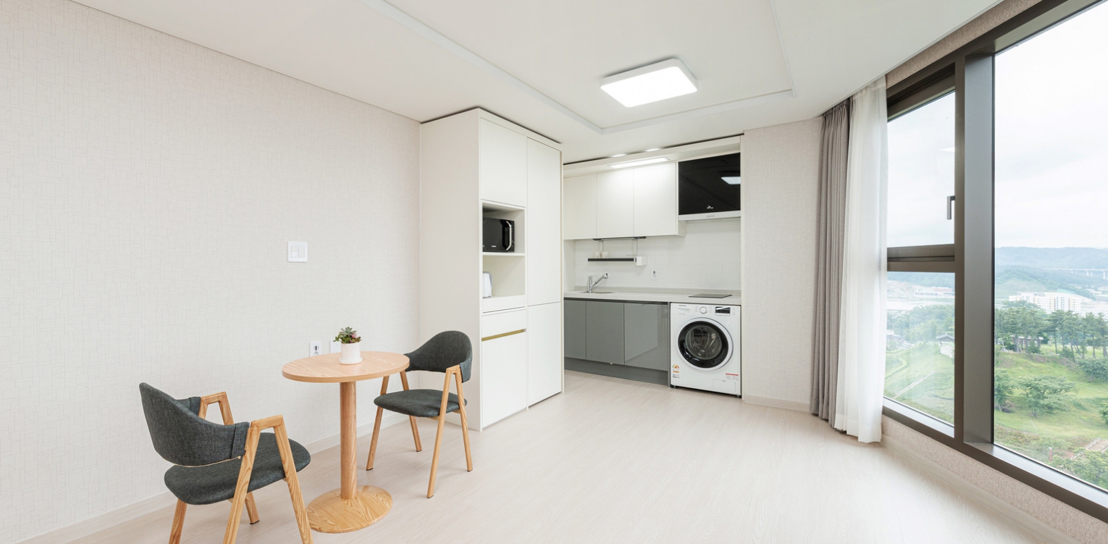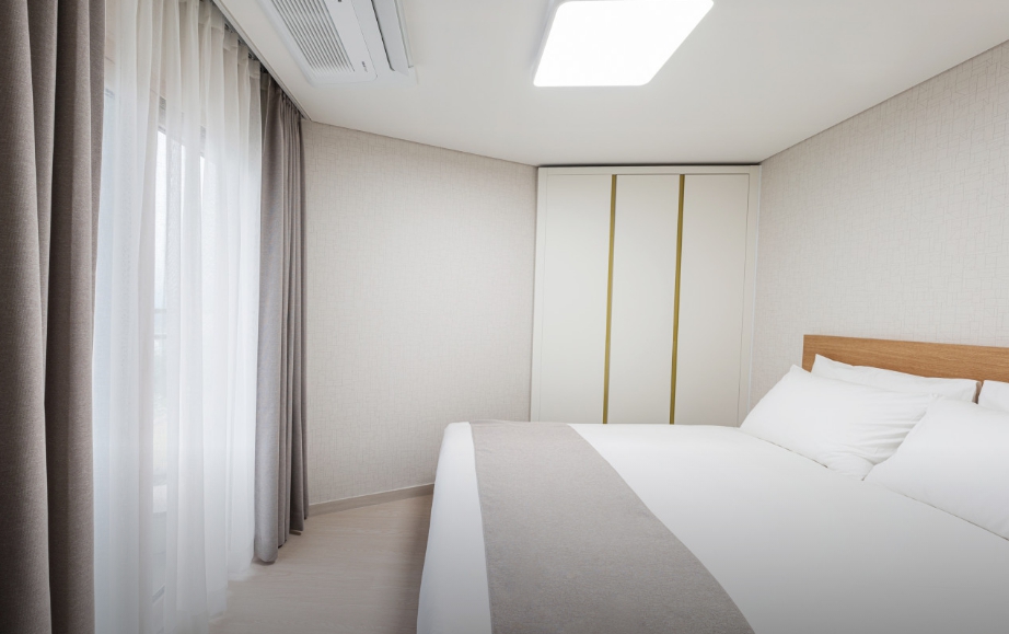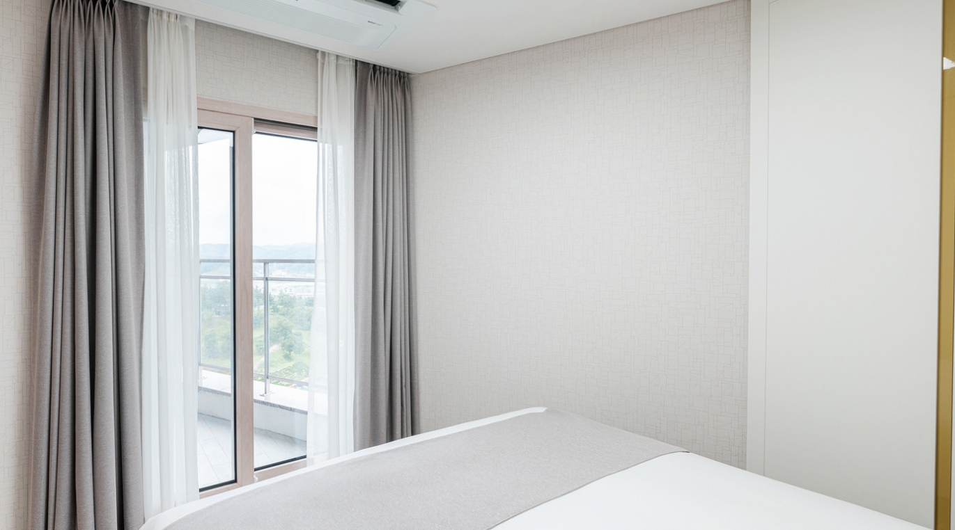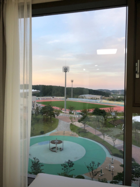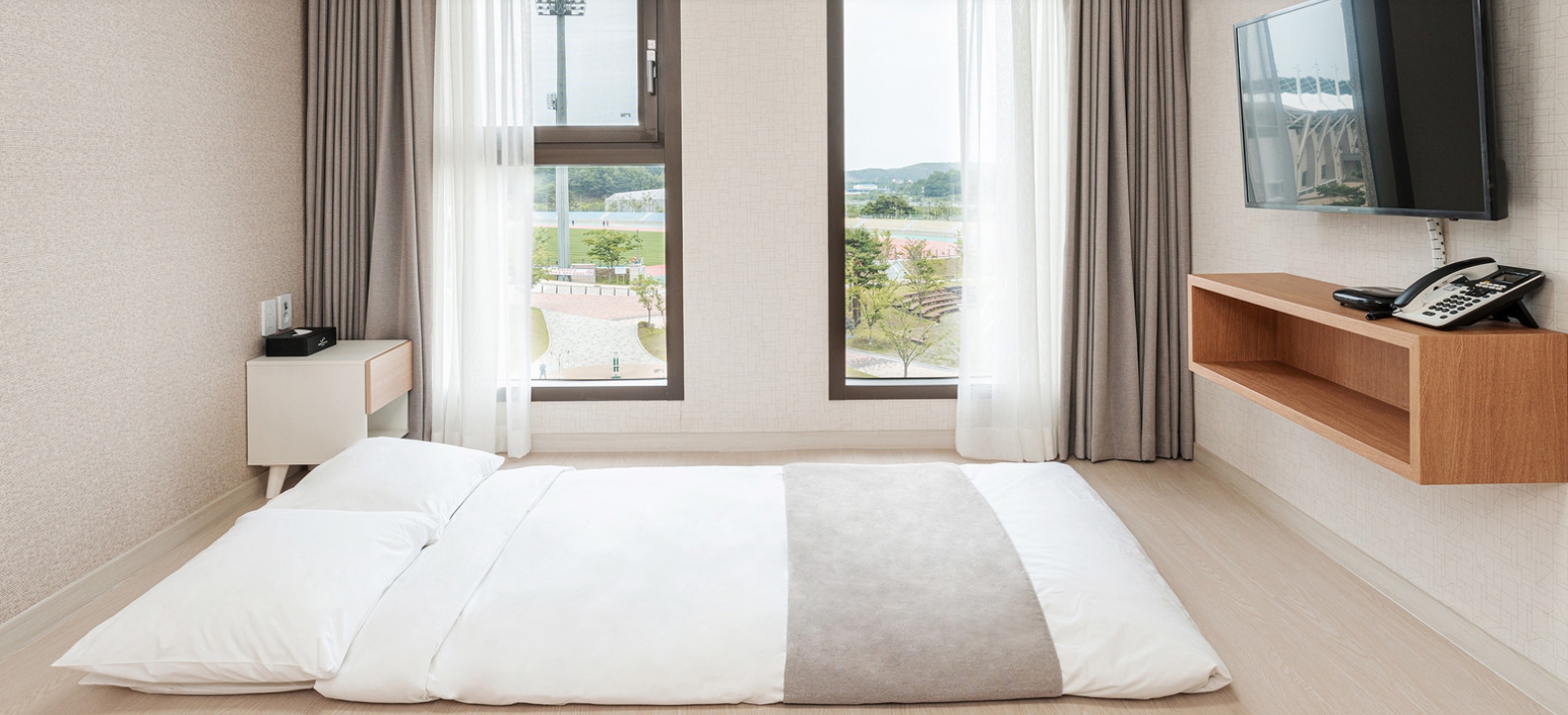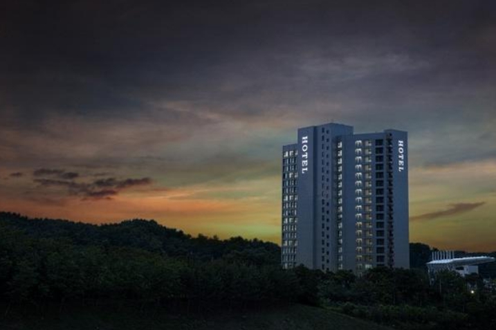 옥외주차장에 주차하고 로비에서 체크인할 때 친절하게 응대해주셔서 기분 좋게 들어갔습니다 ㅎㅎ엘리베이터도 3개라 안기다려서 좋았어요 방은 엄청 깨끗하고 공원 뷰도 좋았습니다. 에어컨 잘 나오고 화장실도 쾌적했어요 세탁기가 구비되어 있어서 워터파크 이용 후에 짤순이로 사용할 수 있어서 좋았어요