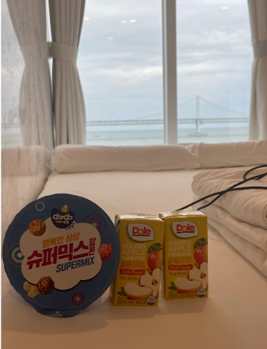 너무 예쁜 광안대교뷰와 웰컴쿠키 드링크 세트에 첫번째 감동을 받고 아침에 일어나서 폰을 보니 무료 조식을 문에 걸어두셨다고 문자가 와있어서 봤더니 컵라면과 콘푸로스트가 들어있는 봉투를 걸어두고 가셨더라구요! 거기서 두번째 감동 받았습니다ㅜㅜ좋은 숙소에 직원분들도 친절하셔서 기분좋게 여행할 수 있었습니다 부산에 다시 놀러오면 또 가고싶을 것 같은 숙소입니다 강추!
