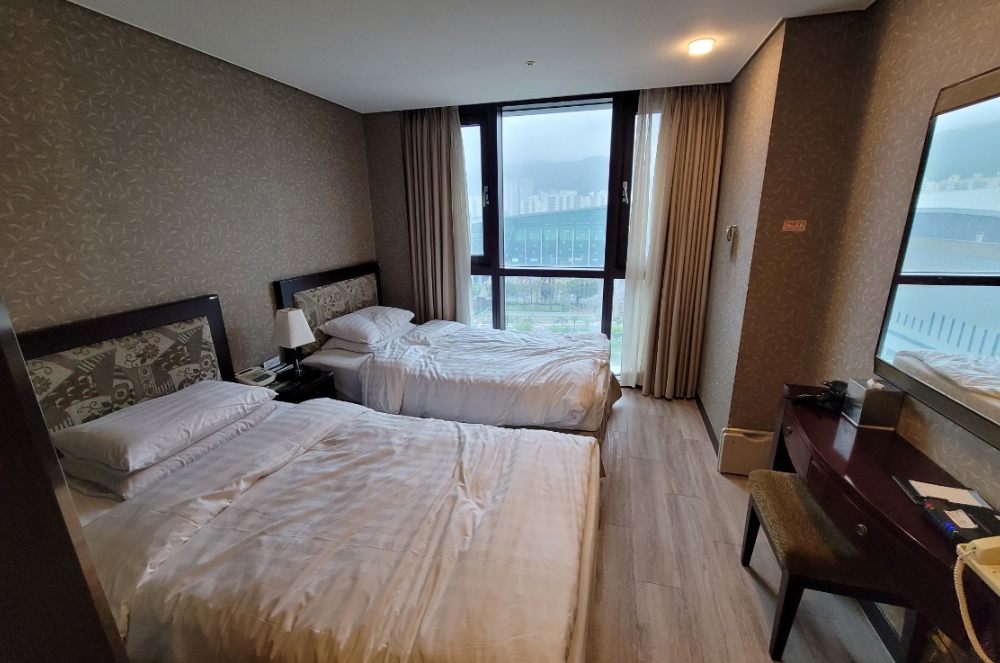 시설은 조금 연식이 있다보니 인테리어가 조금 올드한 느낌이었지만 객실이 넓고 필요한 시설이 다 있네요 객실 내 미니주방, 욕실에 욕조(샤워부스 X), 금고 등도 있구요 어메니티도 잘 갖춰져 있네요 트윈베드 침대였는데 포근했구요 뷰는 벡스코 뷰였고 나쁘진 않았습니다 4성급 호텔답게 로비에 편의점, 커피숍 등이 있었어요, 코인세탁소도 있어서 간단한 빨래도 가능했습니다