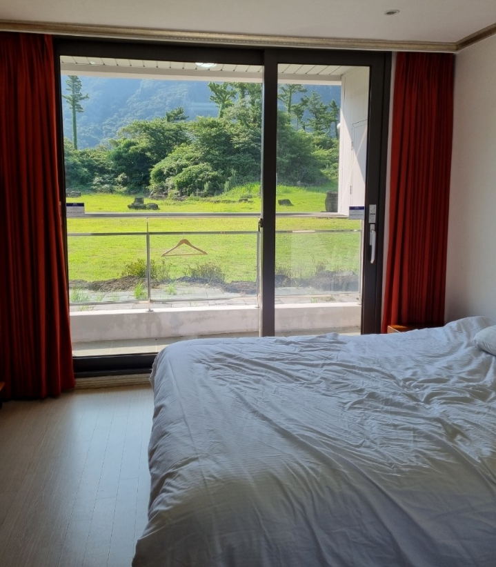 몇 년 전에 가족 여행으로 방 3개 짜리에 묵어본 적이 있어서 이번에도 산방산 쪽을 가게되어 예약해봤어요~ 남편이랑 둘이 이용한 거라 자스민동으로 배정 받았는데 가격 대비 완전 만족입니다~ 산방산 뷰여서 넘넘 좋구요 아침에 일어나서 창문 열었더니 공기가 넘넘 상쾌하고 조용하니 기분이 너무 좋더라구요