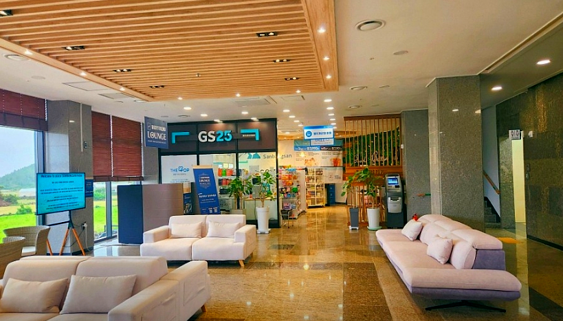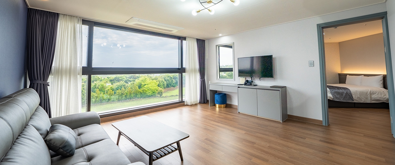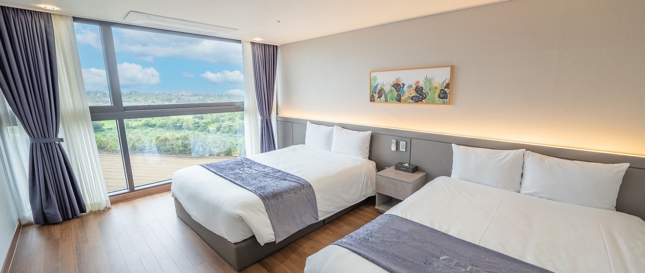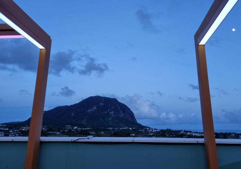 프론트에 계시던 분도 친절히 안내 잘해주셨어요 일층에는 편의점도 있고 건물 내에 빨래방도 있어요! 무엇보다 전경이 진짜 너무 좋았습니다 누워서 바라보는 산방산. 침대에 누우면 바로 산방산이 똬아ㅋㅋㅋ아침에 침대에서 커튼만 치면 일출을 볼 수 있고요 조용해서 엄마아빠가 잘 주무셨어요