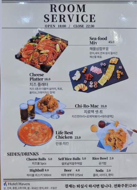 주차장도 주말 아니고서는 충분하지 않을까 생각들어요 건물 내 편의점 CU가 있는데 밤 부터 이른 아침까지는 무인으로 운영중이어서 카드 지참 꼭 하셔야 문이 열려요ㅠ 룸서비스도 기대가 없었는데 인생치킨 넘나 기대이상으로 만족스러웠습니다 사이즈도 엄청크고 바삭하고 넘나 맛있었습니다 다음 여수여행때도 꼭 헤이븐으로 예약할거에요 :)